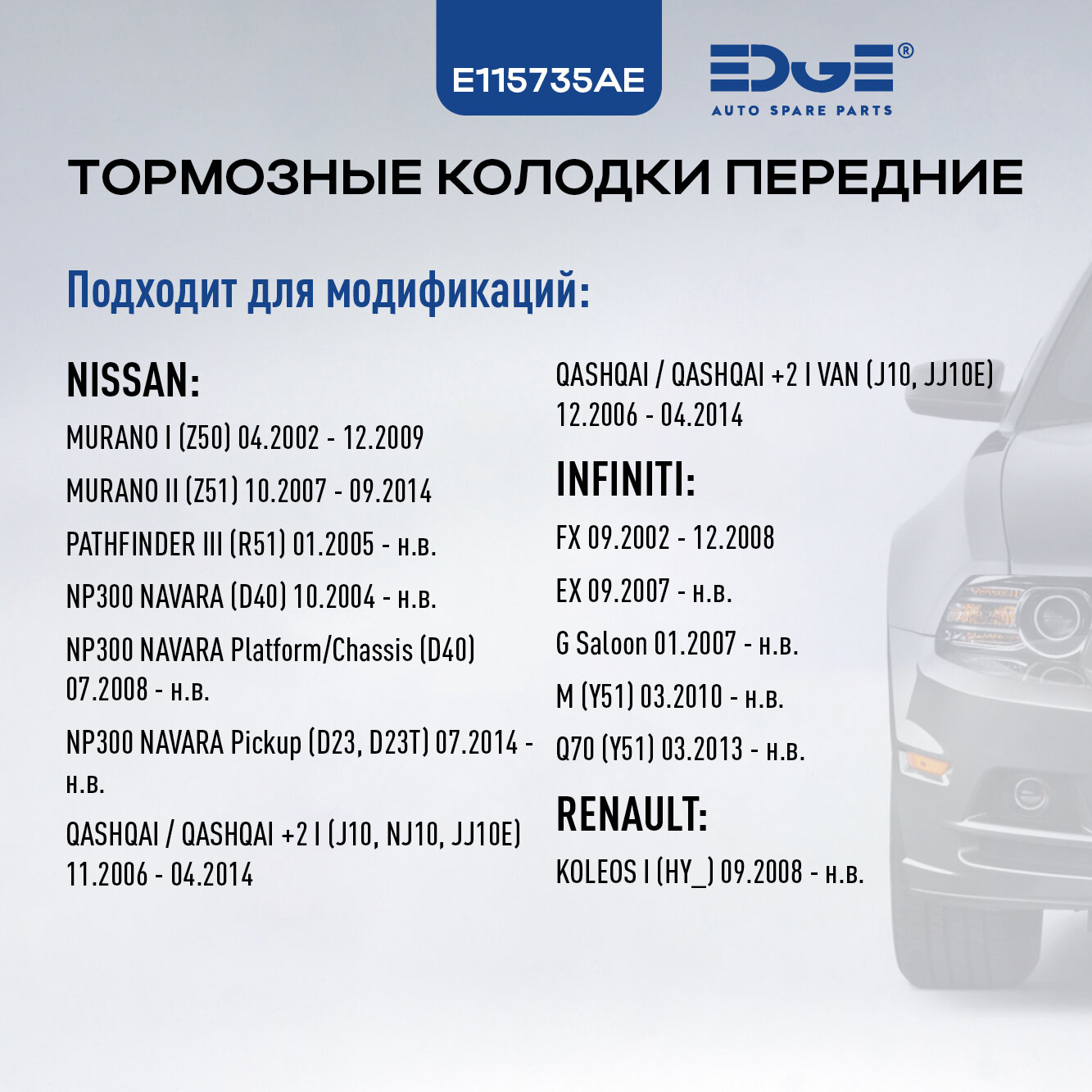 Тормозные колодки передние ниссан кашкай (06-14), NISSAN QASHQAI, E115735AE: сравнение цен, характеристики, фото, актуальное наличие и цены.