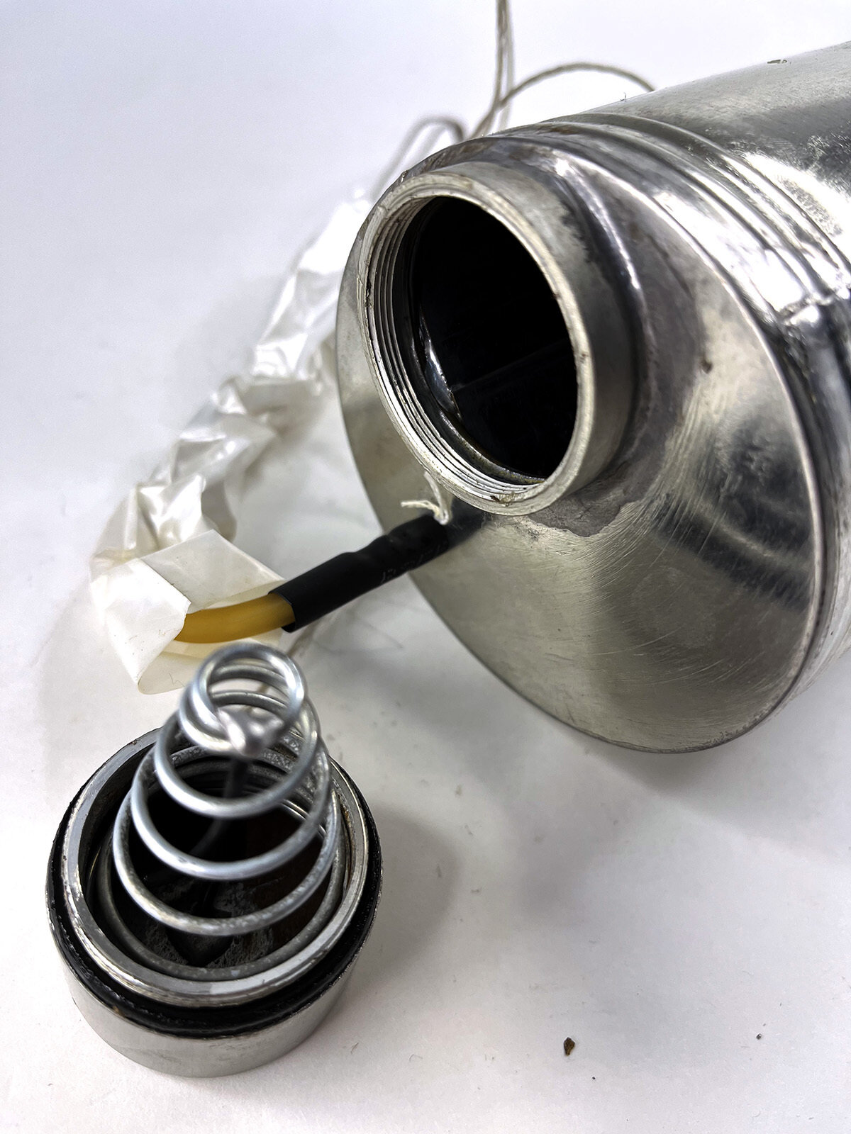 Длина 55 см, диаметр 8.5 см. Работает от 8 батареек ( Установка плюсами вперед по ходу движения торпеды, чтобы горел индикатор зеленым и при переключении шнурком менялся на второй.