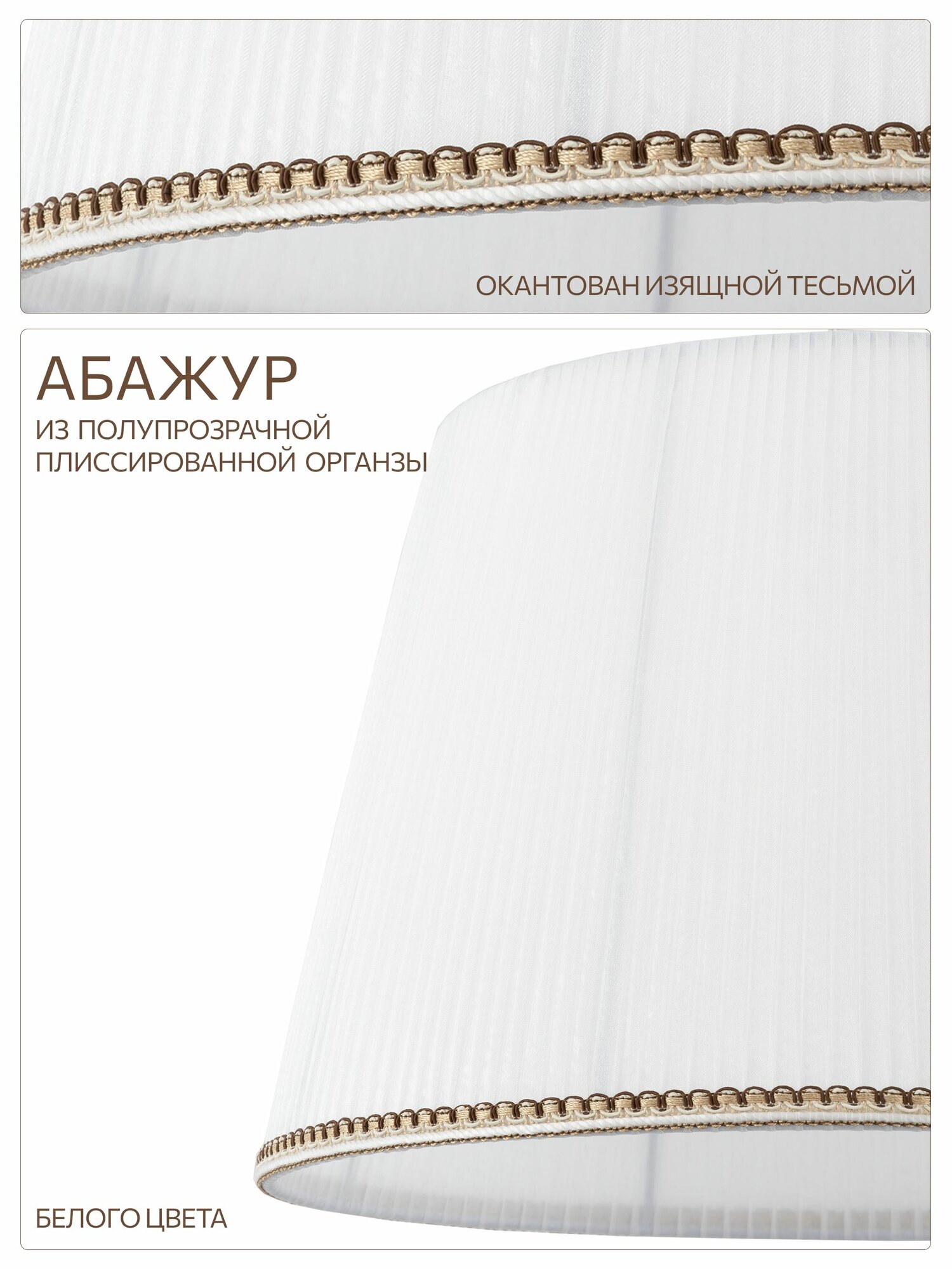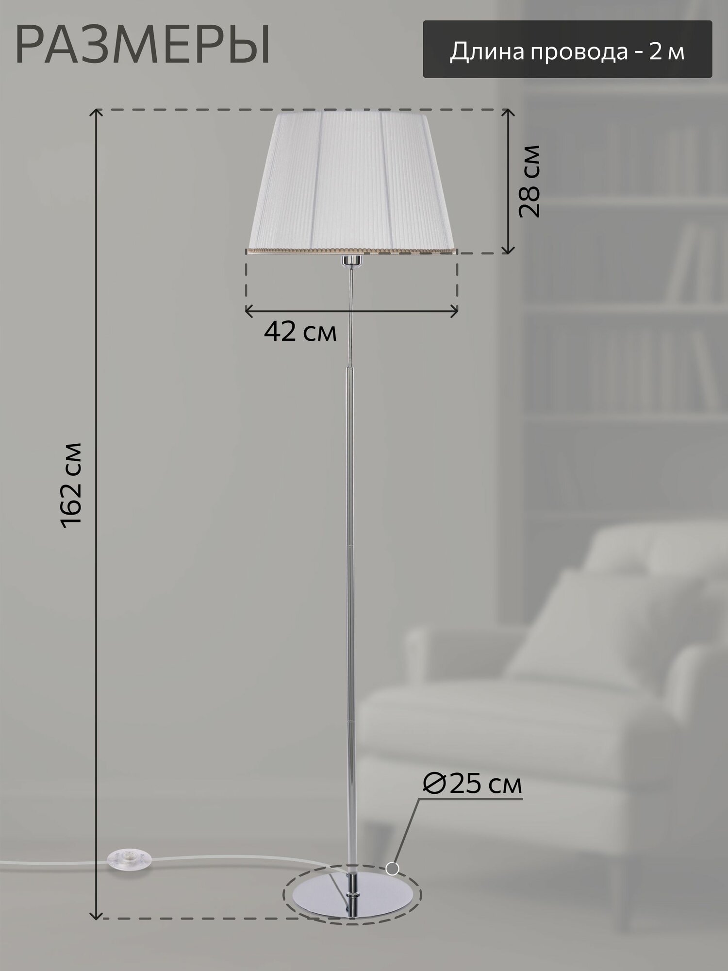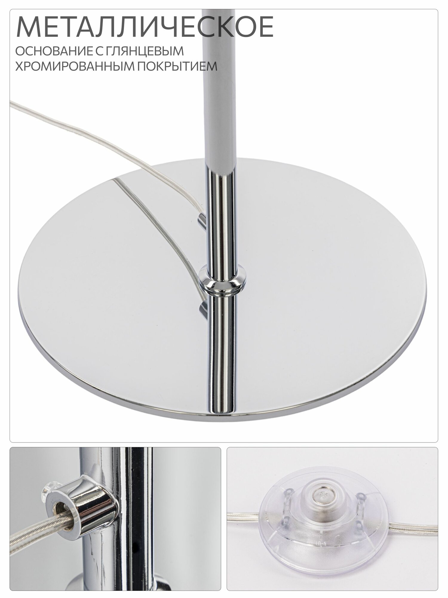 | Дополнительная информация | светильник имеет степень защиты ip20, конструкция отличается устойчивостью благодаря продуманному соотношению высоты и диаметра основания, металлический каркас обладает повышенной прочностью и устойчивостью к механическим воздействиям, плиссированная ткань абажура сохраняет форму при длительной эксплуатации, хромированное покрытие основания устойчиво к царапинам и потускнению, тканевый плафон обеспечивает равномерное рассеивание света без образования резких теней, светильник подходит для использования в помещениях с нормальной влажностью, электротехнические компоненты защищены от перегрева, модель совместима с диммером при использовании соответствующих ламп, декоративные элементы выполнены с высокой точностью, механизм крепления плафона надежный и долговечный, светильник легко вписывается в различные интерьерные решения, освещаемая площадь составляет 3,5 квадратных метра, световой поток 800 люмен обеспечивает комфортное освещение |