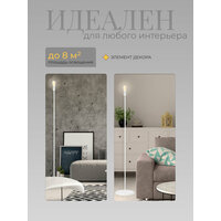 Торшер выполнен в белом цвете и имеет металлическую арматуру. Он работает от сети и оснащен выключателем на проводе. Площадь освещения составляет 10 м². Гарантия 3 года.