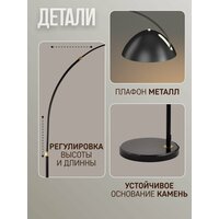 Напольный наклонный светильник на длинной ножке обладает устойчивой металлической конструкцией. Специально разработанный прочный каркас представлен в виде телескопической штанги в форме дуги с мраморным основанием, регулируется по высоте и длине. Оснащен регулируемым направленным нависающим плафоном. Благодаря возможности регулировать наклон и направление света, обеспечивает локальное освещение в любом удобном месте. Его можно использовать как дополнительный источник света в зоне отдыха или как угловой ночник. Можно установить в прикроватной зоне для комфортного чтения книг в ночное время.