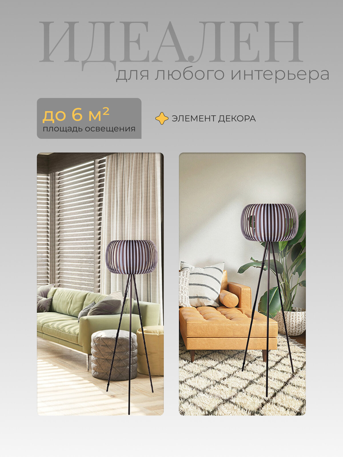 Торшер оснащен одной лампой с цоколем E27 мощностью 15 Вт, что обеспечивает яркое и комфортное освещение площади до 6 м². Выключатель расположен на проводе, что делает использование торшера максимально удобным.