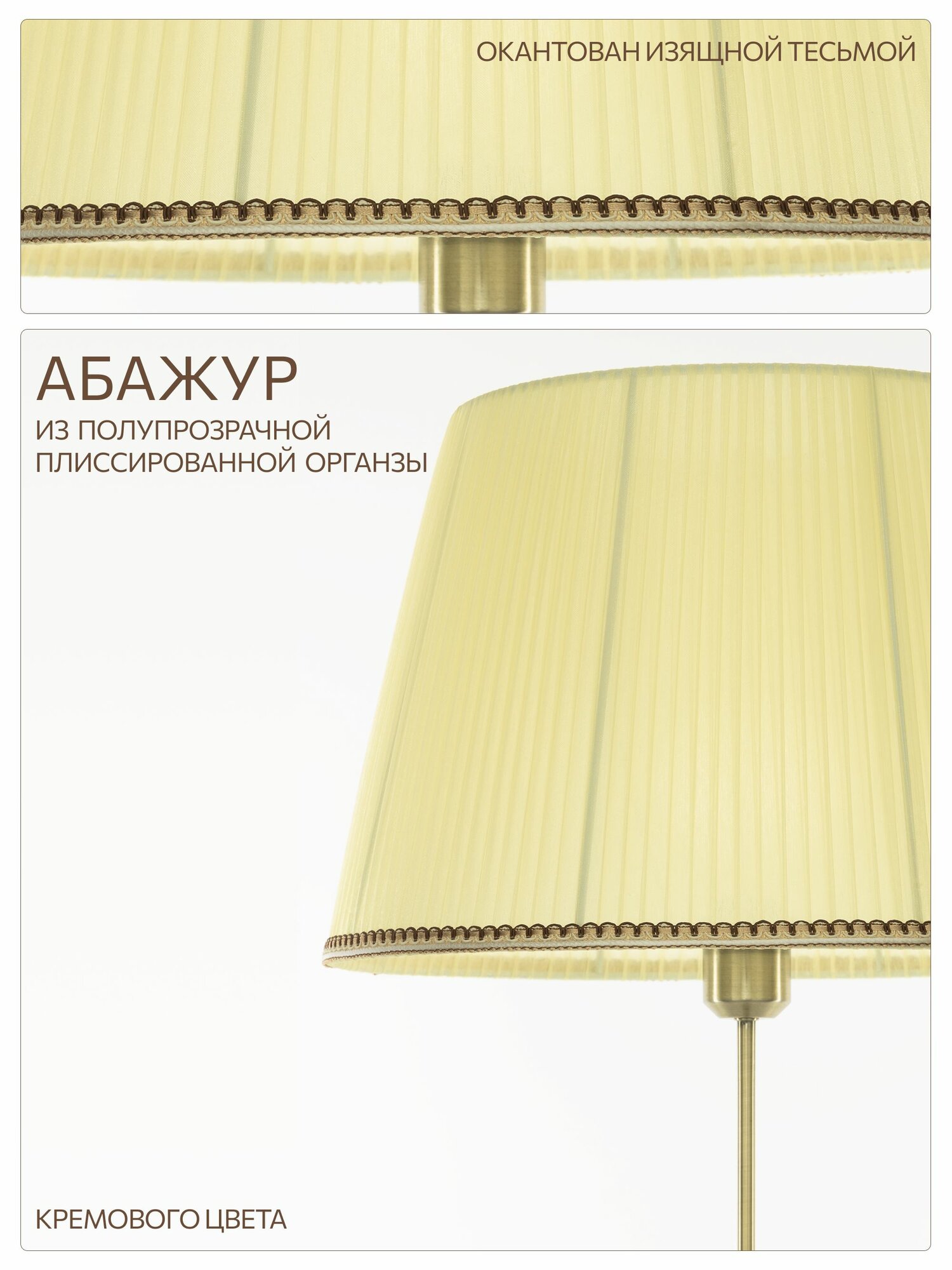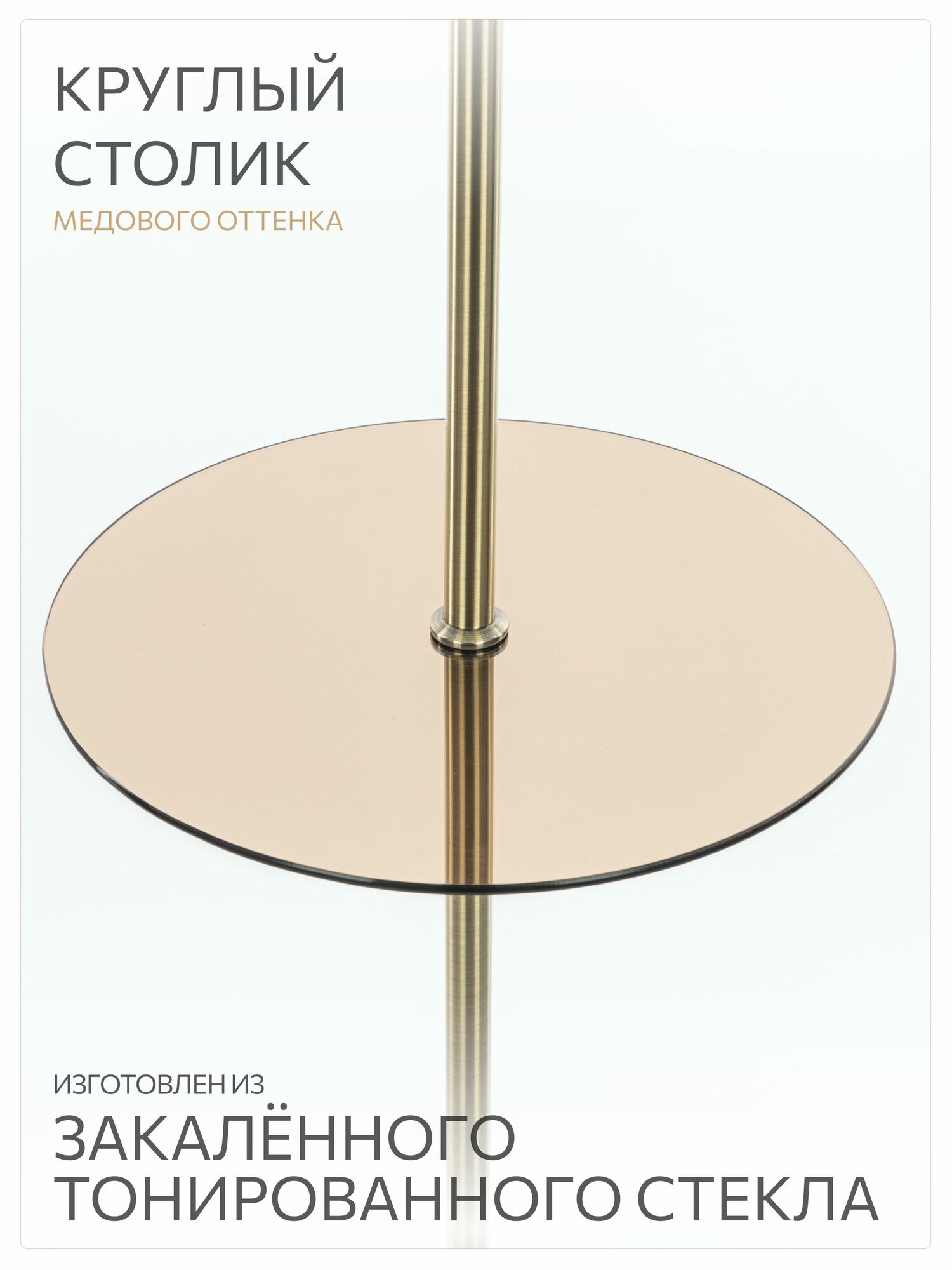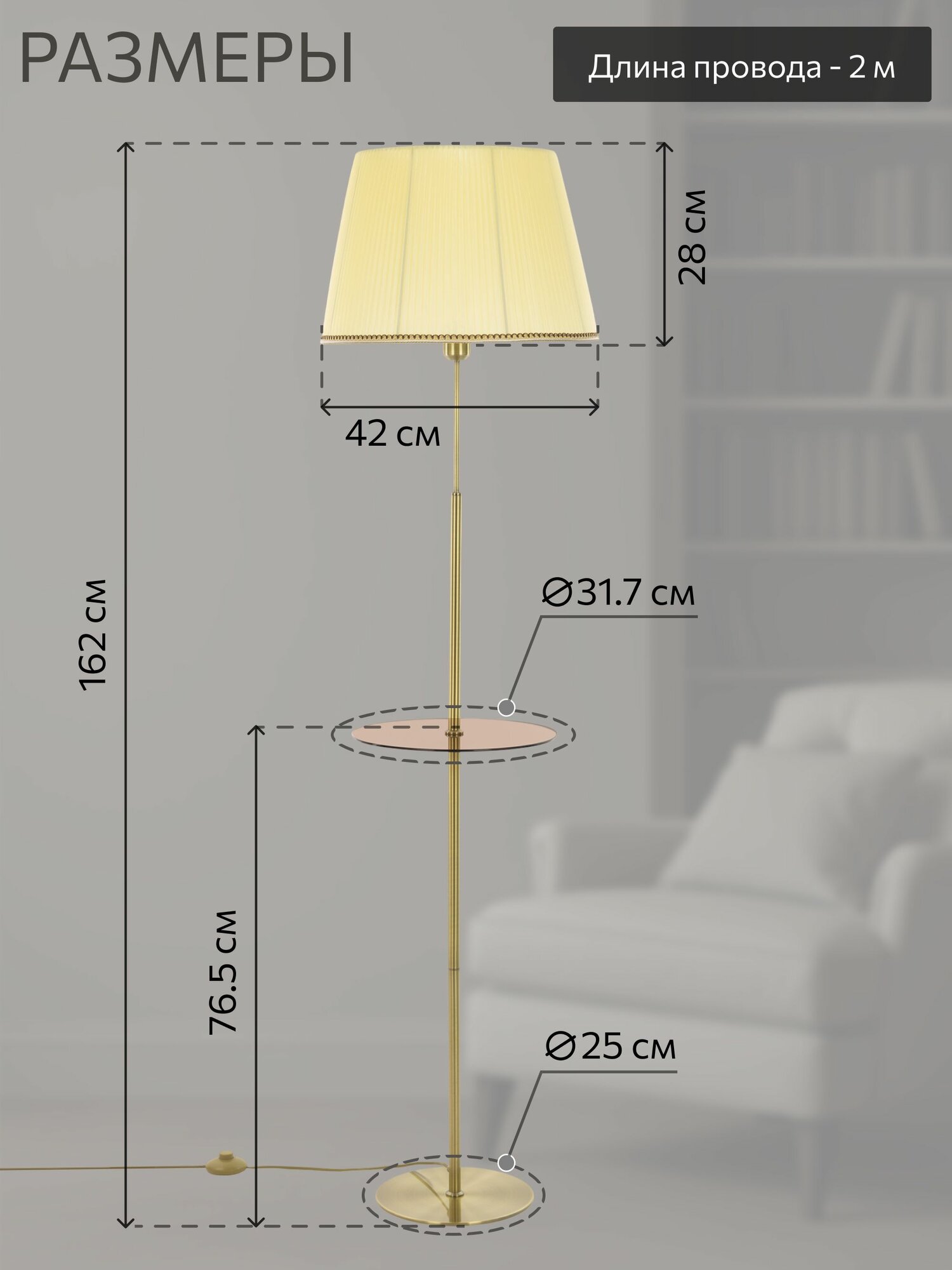 | Дополнительная информация | столешница из закалённого тонированного стекла устойчива к механическим повреждениям и проста в уходе, металлическое основание с бронзовым покрытием имеет защитное антикоррозийное покрытие, плиссированный абажур из кремовой органзы съёмный для удобства очистки, основание оборудовано противоскользящими элементами для устойчивости на любой поверхности, конструкция предусматривает возможность регулировки высоты и наклона плафона, электротехнические компоненты соответствуют международным стандартам безопасности, при использовании светодиодных ламп существенно снижается энергопотребление, степень защиты ip20 обеспечивает надёжную работу в помещениях с нормальной влажностью, напольный выключатель с длиной провода 2 метра позволяет легко управлять освещением, оптимальное освещение площади составляет около 3,5 квадратных метров, световой поток достигает 800 люмен, вес конструкции обеспечивает стабильность при эксплуатации, ребристая поверхность плафона создаёт мягкое рассеянное освещение без резких теней, модель работает от сети 220-240 вольт |