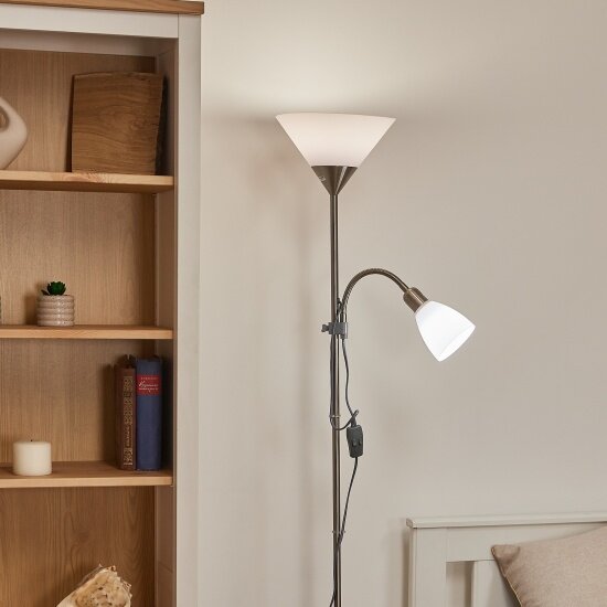 | Особенности | лампы в комплекте, регулировка наклона плафона, регулировка по высоте, режим ночника, с абажуром, с дополнительной лампой для чтения |