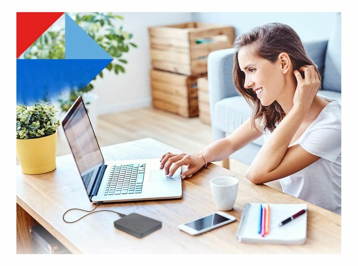 Корпус внешнего жесткого диска HDD выполнен в ненавязчивом черном цвете и имеет стильный лаконичный дизайн. При этом он отлично защищает внутреннее наполнение от внезапных падений и ударов.
