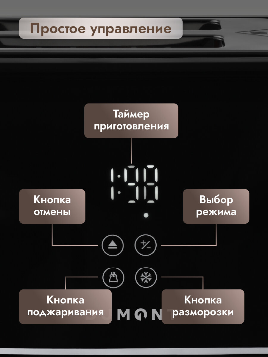 | Дополнительные функции | автоматическое поднятие тостов, автоматическое центрирование тостов, кнопка отмены, регулировка степени обжаривания |