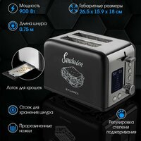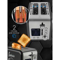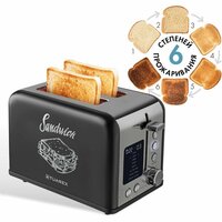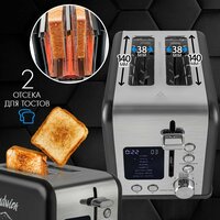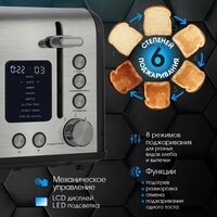 | Дополнительная информация | Тип управления: механический, 6 степеней поджаривания, Функция автоматического центрирования тостов, Термоизолированный корпус, Функции разморозки, Функция подогрева, Функция отмены, Отсек для хранения провода питания, Функция поджарки одного тоста, Съемный поддон для крошек, Прорезиненные ножки, Автоматический выброс тостов, LCD дисплей и LED подсветка кнопок, 8 режимов поджаривания для разных видов хлеба и выпечки |