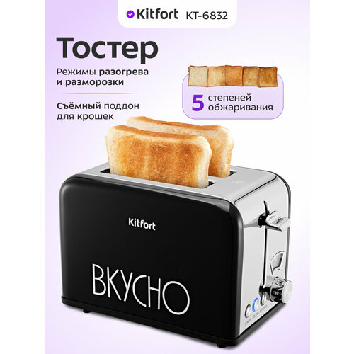 Вкусный завтрак за пару минут! Тостер КТ-6832 создан для тех, кто любит полакомиться ароматным и хрустящим поджаренным хлебом. Особый вкус и цвет корочки тостов получаются такими благодаря карамелизации сахара, содержащегося в муке, при инфракрасном нагреве в процессе приготовления. Выберите то, что подходит именно вам Тостер оснащён несколькими дополнительными функциями: «Разогрев» разогревает без обжарки. «Разморозка» позволяет приготовить тосты из замороженного хлеба. «Отмена» выключает тостер раньше автоматического выключения по истечении установленного времени. Каждый день – новая обжарка! С помощью регулятора степени обжаривания настраивается степень обжаривания тостов от «1» до «5». «1» — означает минимальное время и лёгкую обжарку, «5» — максимальное время и сильную обжарку. Лёгок в очистке Съёмный поддон для крошек позволяет легко и удобно очистить тостер от хлебных крошек. Чтобы достать поддон из нижней части корпуса устройства, необходимо потянуть его на себя, а затем вытряхнуть из поддона все крошки. Подходит для разных тостов! Максимальная толщина тостов не должна превышать 2,5 см. Рекомендуется использовать тосты толщиной 1 - 1,2 см. По окончании приготовления тостер автоматически отключается, а тосты поднимаются вверх для удобного извлечения.