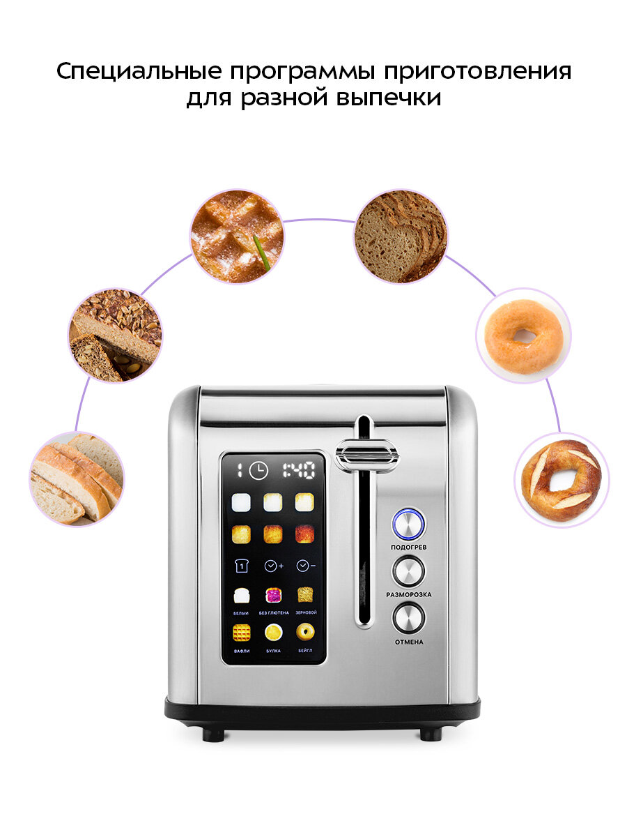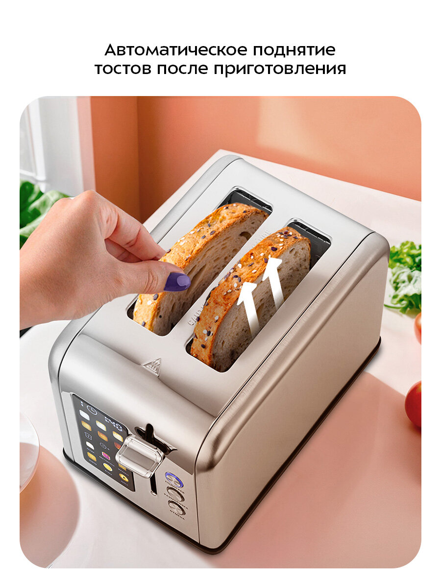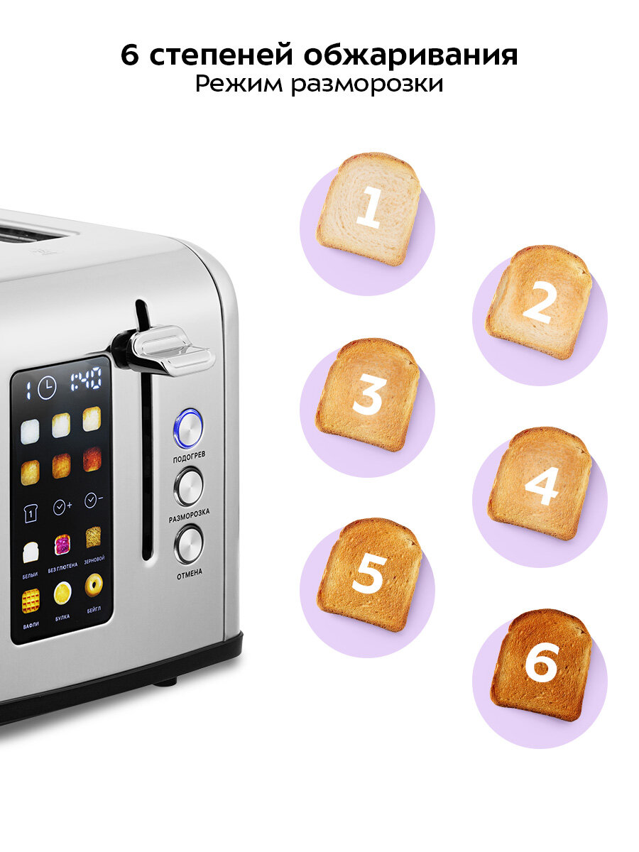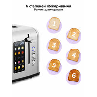 | Дополнительные функции | автоматическое поднятие тостов, автоматическое центрирование тостов, кнопка отмены, регулировка степени обжаривания |