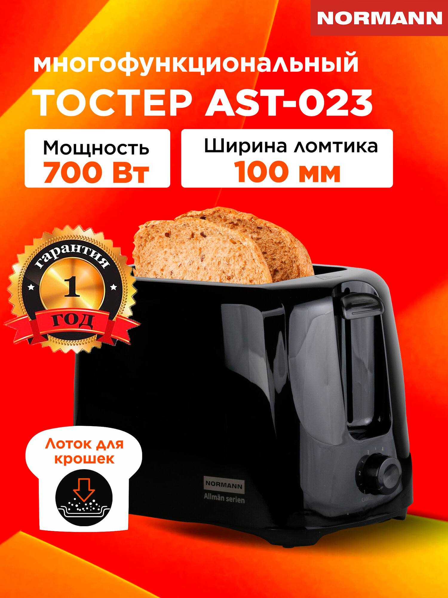 Тостер NORMANN AST 023, 700 Вт, 2 ломтика, чёрный – поддон для крошек + регулировка степени обжаривания: сравнение цен, характеристики, фото, актуальное наличие и цены.