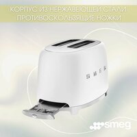 Тостер Smeg TSF 01 CHEMU в корпусе из нержавеющей стали с пластиковым термоизолированным покрытием отличается не только эстетичным внешним видом, но и безопасностью в использовании. Система автоматического центрирования не допускает перекашивания ломтиков хлеба, приводящего к их пригоранию. Устройство можно использовать для деликатного размораживания тостов, булочек и других продуктов. Функция «Багель» позволяет поджаривать ломтики только с одной стороны. Съёмный поддон для крошек значительно облегчает очистку тостера и не допускает пригорания остатков продуктов, приводящего к распространению неприятного запаха. Широкие прорезиненные ножки защищают устройство от падения даже при случайных толчках и рывках провода. Для разработки дизайна своей техники Smeg привлекает мировых архитекторов, ведь кто, как не они, разбирается в стиле? В холодильниках, варочных панелях, стиральных машинах и других приборах нашла своё отражение настоящая итальянская страсть. И такие яркие образы не могли не получить признания: техника бренда неоднократно завоёвывала международные призы за оформление, среди которых несколько престижнейших премий iF Design Award и Red Dot Design Award в 2016 и в 2017 годах.