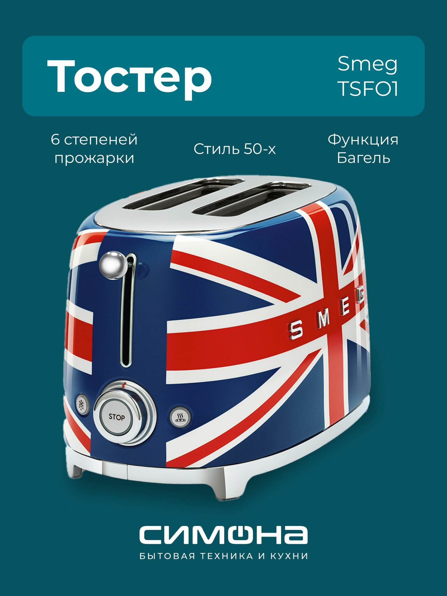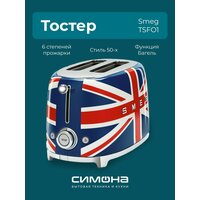 Тостер на 2 ломтика, Цвет британский флаг; Функции: подогрев, размораживание, багель; 6 уровней поджаривания; Съемный поддон для крошек.