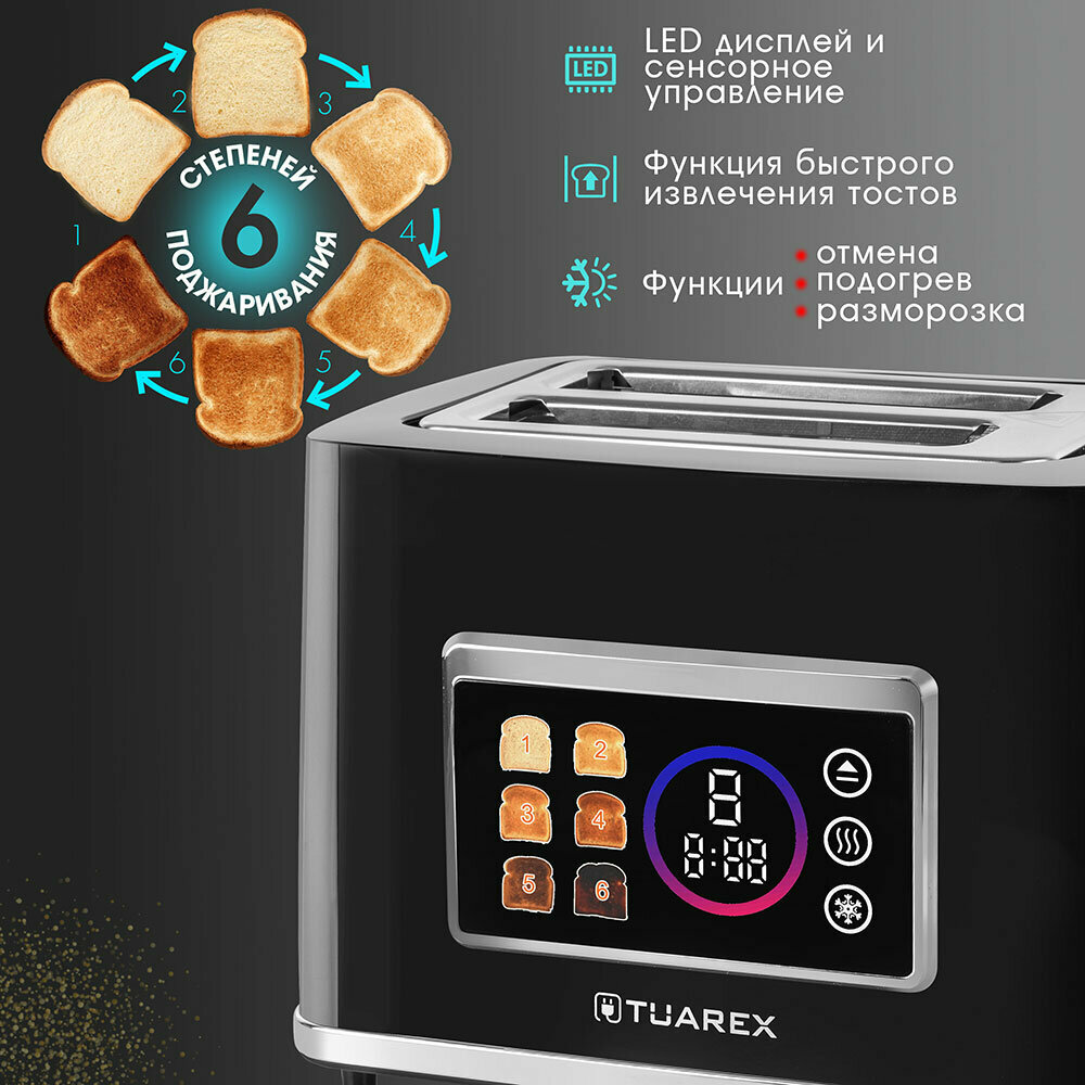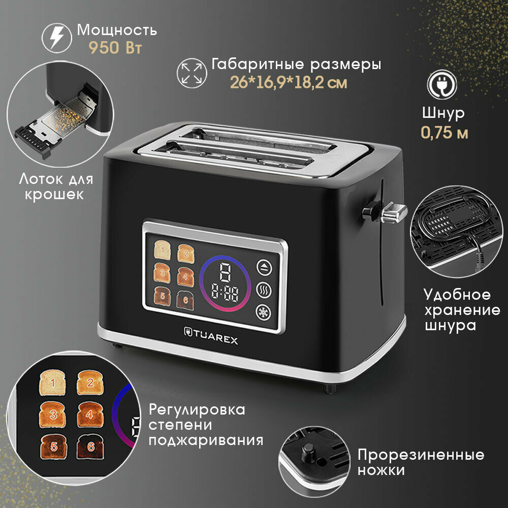 | Дополнительные функции | автоматическое поднятие тостов, автоматическое центрирование тостов, кнопка отмены, плавная регулировка температуры, регулировка степени обжаривания |