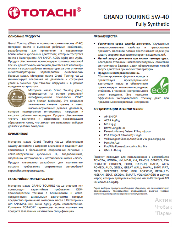 Grand Touring 5W-40 – полностью синтетическое (ПАО) моторное масло с высокими рабочими свойствами, разработанное для применения в современных бензиновых и дизельных двигателях, которым требуется масло с Категориями API SN/CF, ACEA A3/B3 или A3/B4. Продукт обеспечивает превосходную толщину смазочной пленки для оптимальной защиты двигателя от износа при низких и высоких рабочих температурах за счет отличных низкотемпературных характеристик синтетических базовых масел. Моторное масло Grand Touring 5W-40 минимизирует отложения на двигателе и сокращает уровень эмиссии при тяжелых нагрузках и в режиме вождения «старт-стоп». Моторное масло Grand Touring 5W-40 производится на основе уникальной антифрикционной технологии ZFM (Zero Friction Molecular). Это позволяет значительно снизить трение и износ высоконагруженных деталей двигателя, которые подвергаются интенсивным нагрузкам и высоким рабочим температурам. Продукт обеспечивает чистоту двигателя и эффективно предотвращает образование лаков, что делает его идеальным выбором для всех условий вождения. спецификации И соответствия API SN/CF ACEA A3/B4;
