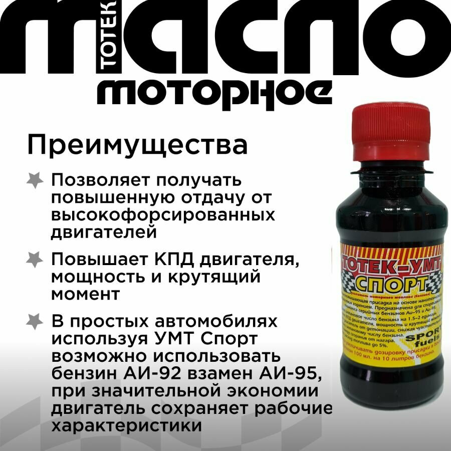 тотек Усилитель моторного топлива УМТ-Спорт 100мл – это высококачественная присадка в топливо, предназначенная для автолюбителей и профессионалов, стремящихся улучшить производительность своего автомобиля. В категории автотоваров и автохимии, данный продукт занимает достойное место благодаря своим уникальным характеристикам и эффективности.