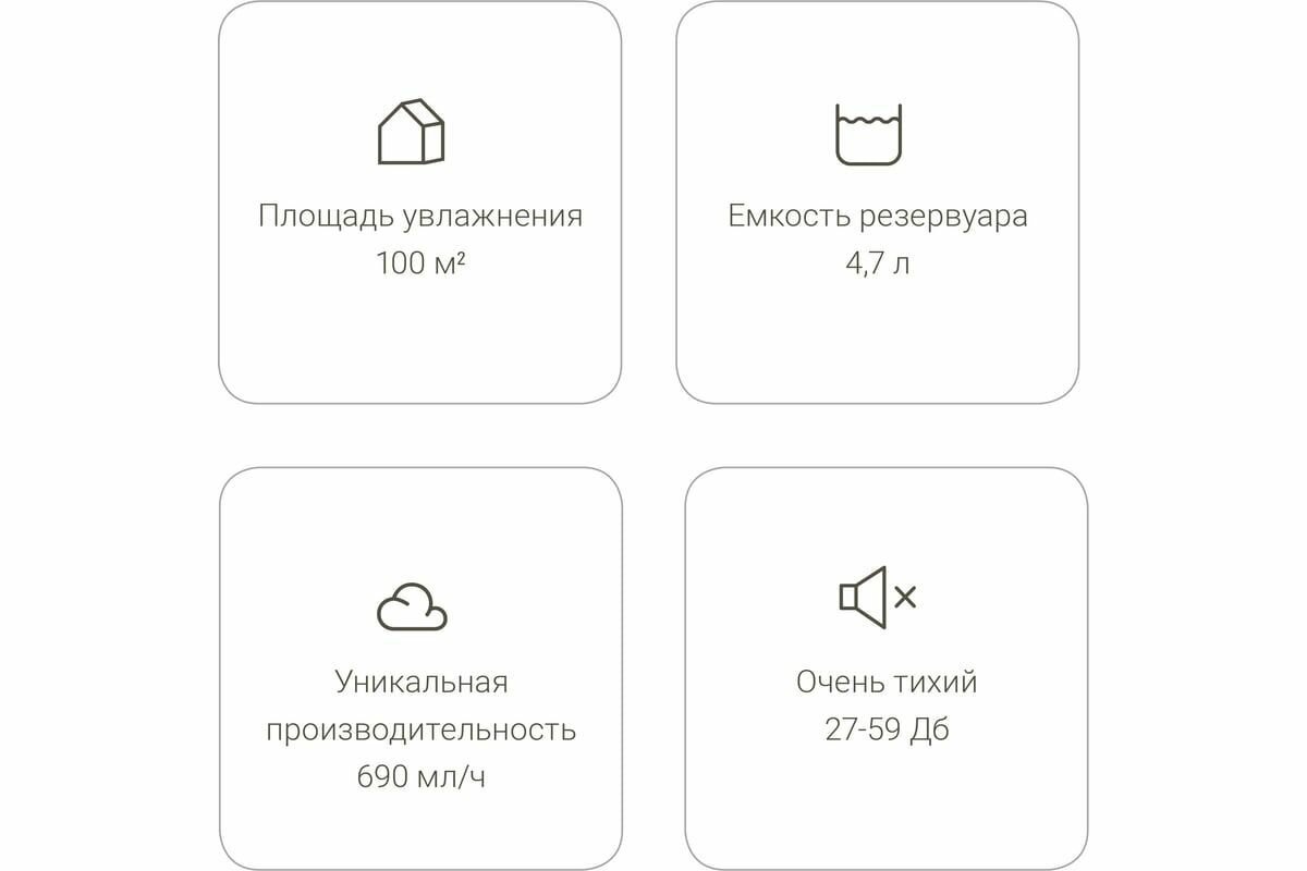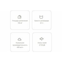 гигростат, индикация работы, регулировка направления воздушного потока, регулировка скорости вентилятора/интенсивности испарения, таймер, управление со смартфона