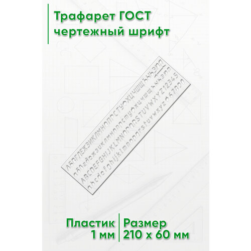 Надписи на чертежах и других конструкторских документах, выполненных от руки, должны соответствовать госту 2.304-81. На трафарете представлены примеры начертания шрифта типа Б под наклоном около 75° по госту 2.304-81 (цифры, заглавные и строчные буквы русского алфавита (кириллицы). С помощью трафарета вы сможете сделать надписи высотой 5 и 7 мм. Допускается неровность контуров трафаретов глубиной ±0-200 мкм. В силу технологии производства допускается наличие более неровных участков до 2% от общей длины контуров. Для получения наилучшего результата написания используйте хорошо заточенный карандаш толщиной менее 1 мм. Размер: 6 х 21 х 0,1 см Материал: сертифицированный ПЭТ
