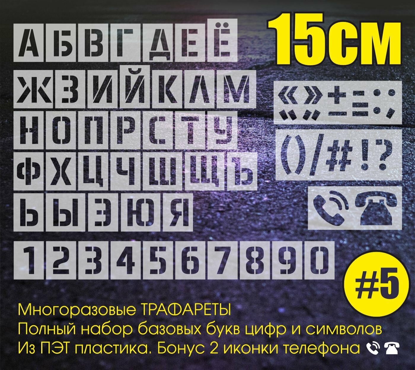 Трафареты №5 из прозрачного пластика 0,7 мм толщиной. Каждая буква и цифра отдельный трафарет для удобства позиционирования. Высота буквы и цифры составляет 15 см. Бонус - 2 разные иконки телефона.