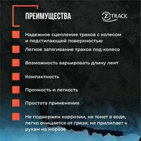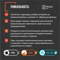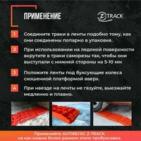 Антибукс «Z-TRACK» -разработанное в России простое и надежное средство самостоятельной помощи автомобилисту, предназначенное для подкладывания под буксующие колеса застрявшего автомобиля, чтобы повысить сцепление колес с подстилающей поверхностью будь то снег, грязь, песок, глина, болотистая или рыхлая почва и даже лёд. Траки имеют сетчатую структуру, ребра которой не прямолинейны, а имеют Z-образную форму. Благодаря такому строению достигается максимальная прочность трака во всех направлениях, кроме того, сами же ребра являются не только несущей основой трака, но и направленными элементами зацепления за колесо и подстилающую поверхность одновременно. Сверху и снизу ребра дополнительно покрыты многочисленными шипами для улучшения сцепления в первый момент контакта колеса с траком, когда автомобиль еще не наехал на трак колесом и не прижал его к поверхности покрышки и подстилающей поверхности. Для предотвращения проскальзывания траков под колесом «на ровном месте» траки имеют толщину равную 40 мм, а на передней части трака выполнен уклон покрытый шипами для облегчения наезда колеса на трак. И в дополнение ко всему, трак оснащен металлическими шипами с нижней стороны для гарантированного сцепления трака с ледяной поверхностью, которые устанавливаются в случае необходимости. Данные антибуксы компактны, не подвержены коррозии, температурный режим от -30°C до +60°, не тонут в воде, легко очищаются от различных загрязнений и будут незаменимым помощником при езде по бездорожью! Используя антибукс, вы можете, не прибегая к посторонней помощи вызволить автомобиль из грязевой или ледяной ловушки не обладая специальной подготовкой и не применяя дополнительные специальные средства. Отличное дополнение в вашем багажнике к домкрату, аптечке и запасному колесу. Антибукс позволит Вам быстро, без затруднений и посторонней помощи вытащить буксующий автомобиль из колеи.