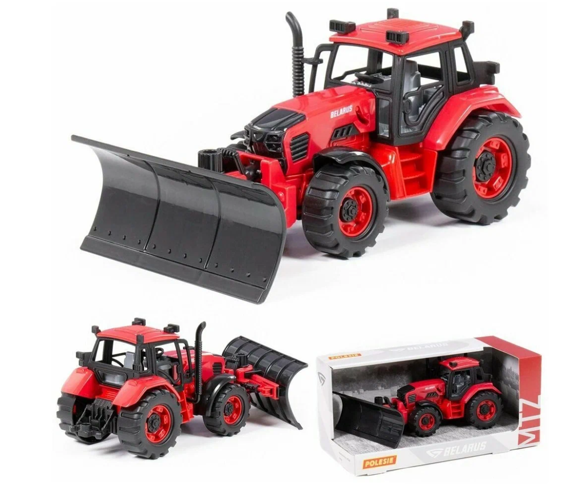 Трактор имеет подвижный отвал и поднимающуюся крышку капота, под которой находится реалистичная имитация настоящего двигателя. Игрушка отличается детализированным и ярким дизайном, что максимально приближает её к реальности. Трактор оснащён инерционным механизмом.
