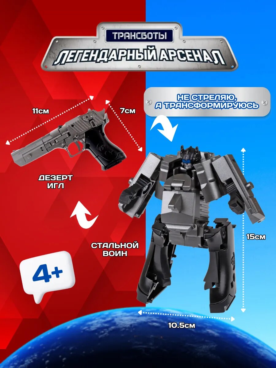 Трансботы " Легендарный арсенал Desert Eagle" 1toy это легендарный Арсенал, и у меня особая миссия. Я – не просто робот игрушка, я – робот пистолет, защитник и страж порядка. Моя форма маскируется под легендарный пистолет, но когда приходит время, я раскрываю свою истинную силу – мощного робота с высокотехнологическим оружием и непробиваемой броней. Меня создали, чтобы я, робот трансформер, охранял спокойствие на Земле и боролся с любыми угрозами! В моей команде трансформеры, а именно детские пистолеты для мальчиков: игрушечный пистолет Дезерт Игл, лёгкий Глок, пистолет игрушки – Кольт, револьвер Смит энд Вэссон и легендарный пистолет детский для мальчика Маузер. Только вместе трансботы игрушки способны объединиться в одного гигантского мегаробота Робострела – неукротимого и непревзойденного защитника нашей планеты. Каждая трансформер игрушка требует точных движений при трансформации из пистолета в робота и обратно. Мелкие детали стимулируют развитие мелкой моторки. Робот трансформер для мальчика способствует развитию логического мышления, ведь чтобы собрать робота, ребёнок должен продумать, как двигать и соединять части игрушки для мальчиков. Фигурка трансформер вдохновляет на создание собственных сюжетов и историй, это стимулирует фантазию и воображение. Мини робот имеет размер: 10,5х15 см. Размер пистолета: от 10 до 11 см в зависимости от вида. Размер блистера 12х15,5 см. Пистолет детский – это подарок мальчику, подарок сыну, подарок младшему брату, новогодние подарки для детей, подарки на новый год 2025 детям, подарок на 23 февраля мальчику, подарок для мальчика. В коллекциях 1TOY также есть такие игрушки, как машинка трансформер, робот машина, робот машина трансформер, машина трансформер.
