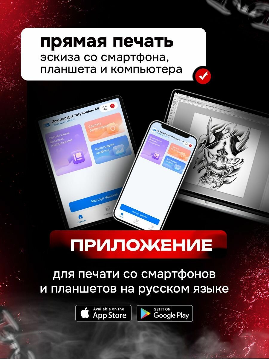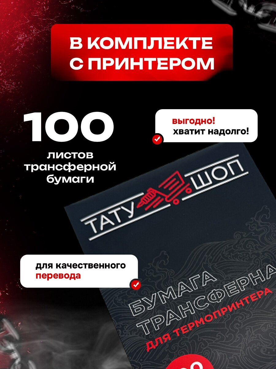 Устали тратить драгоценное время на ручной перевод эскизов? Представляем вашему вниманию революционный портативный беспроводной термопринтер для печати тату-эскизов + 100 листов бумаги в комплекте! Этот компактный и мощный прибор станет незаменимым помощником как для опытных тату-мастеров, так и для новичков в этом искусстве. Забудьте о долгих и утомительных минутах, проведенных за копированием эскизов. Просто загрузите изображение в приложение, подключитесь к принтеру по беспроводной связи и получите четкий, готовый к переводу эскиз на специальной трансферной тату бумаге всего за несколько секунд!