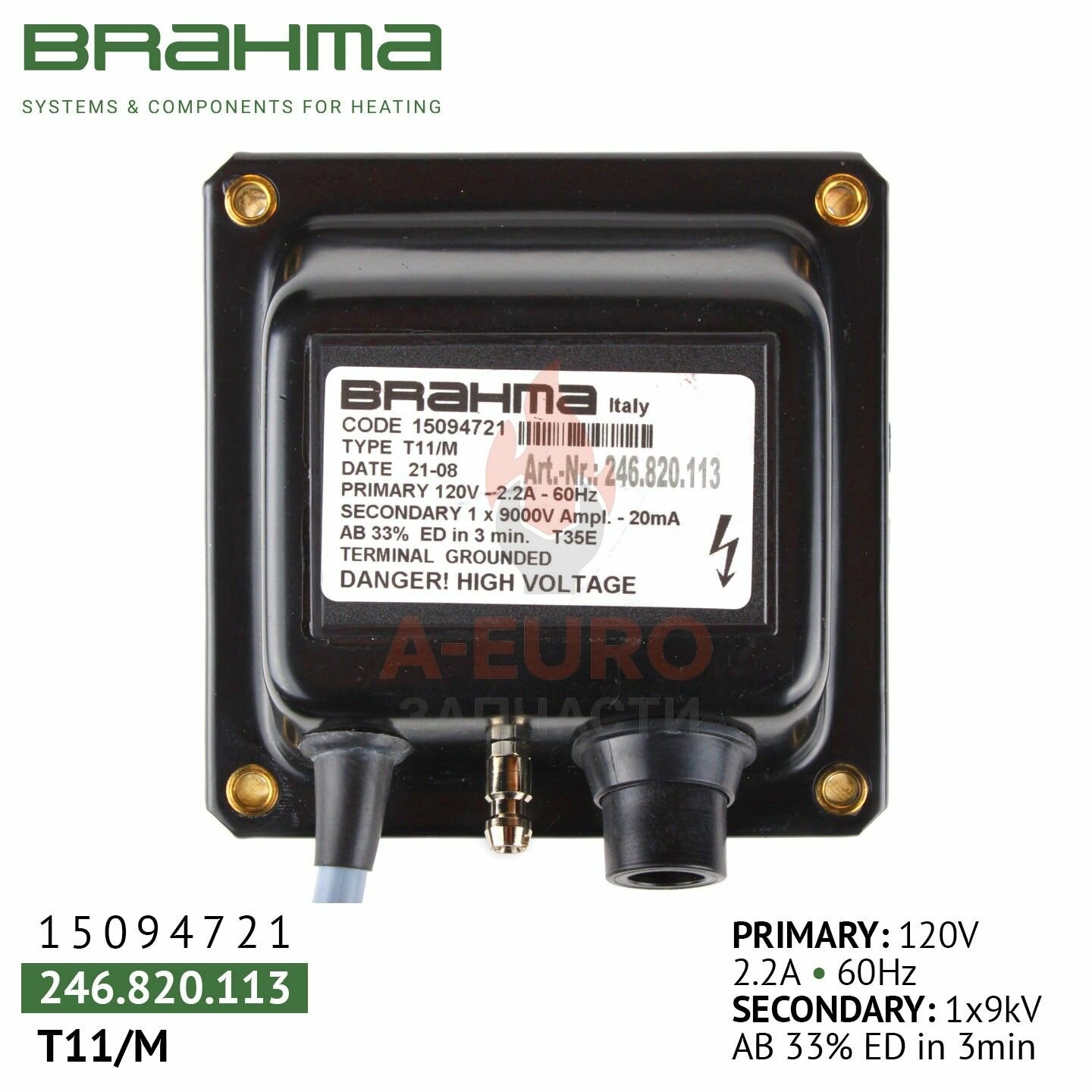 - Трансформаторы розжига BRAHMA T11/M 15094721 обладают высокой мощностью разряда, что делает их идеальным выбором для применений, где требуются длинные провода зажигания.