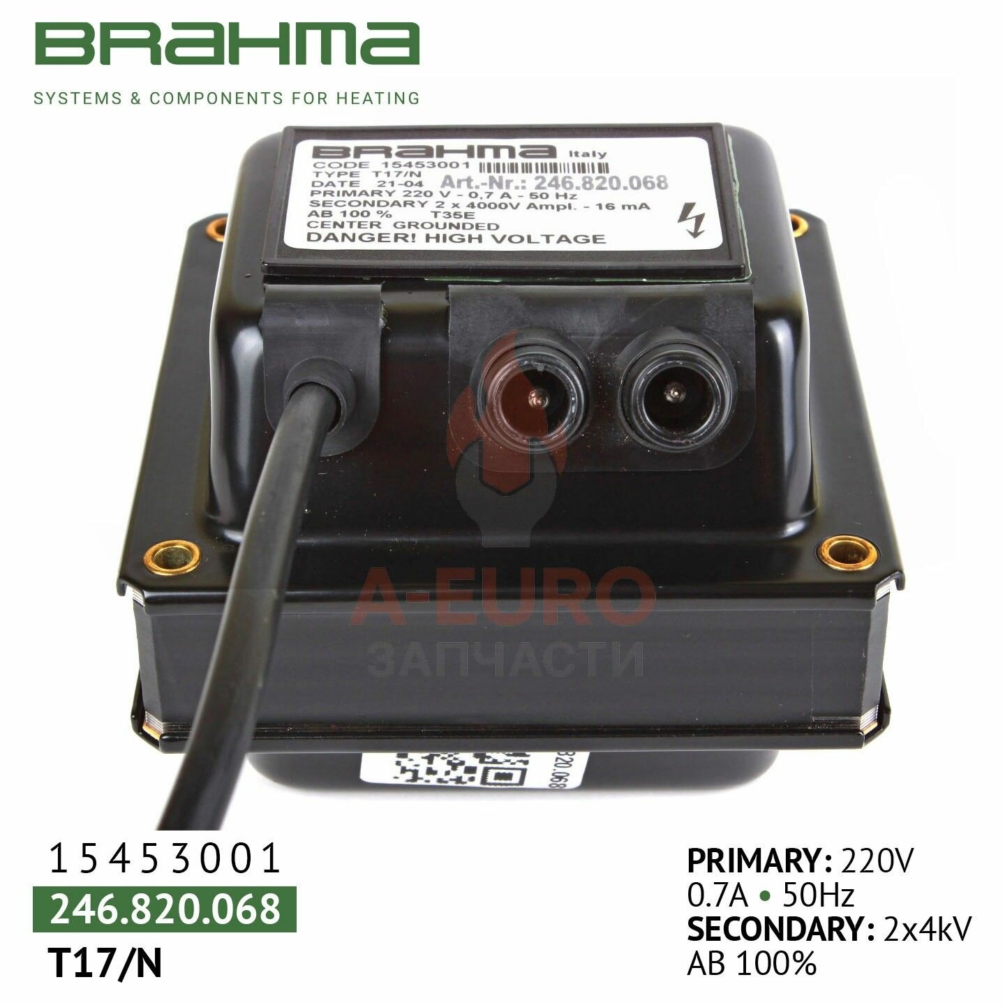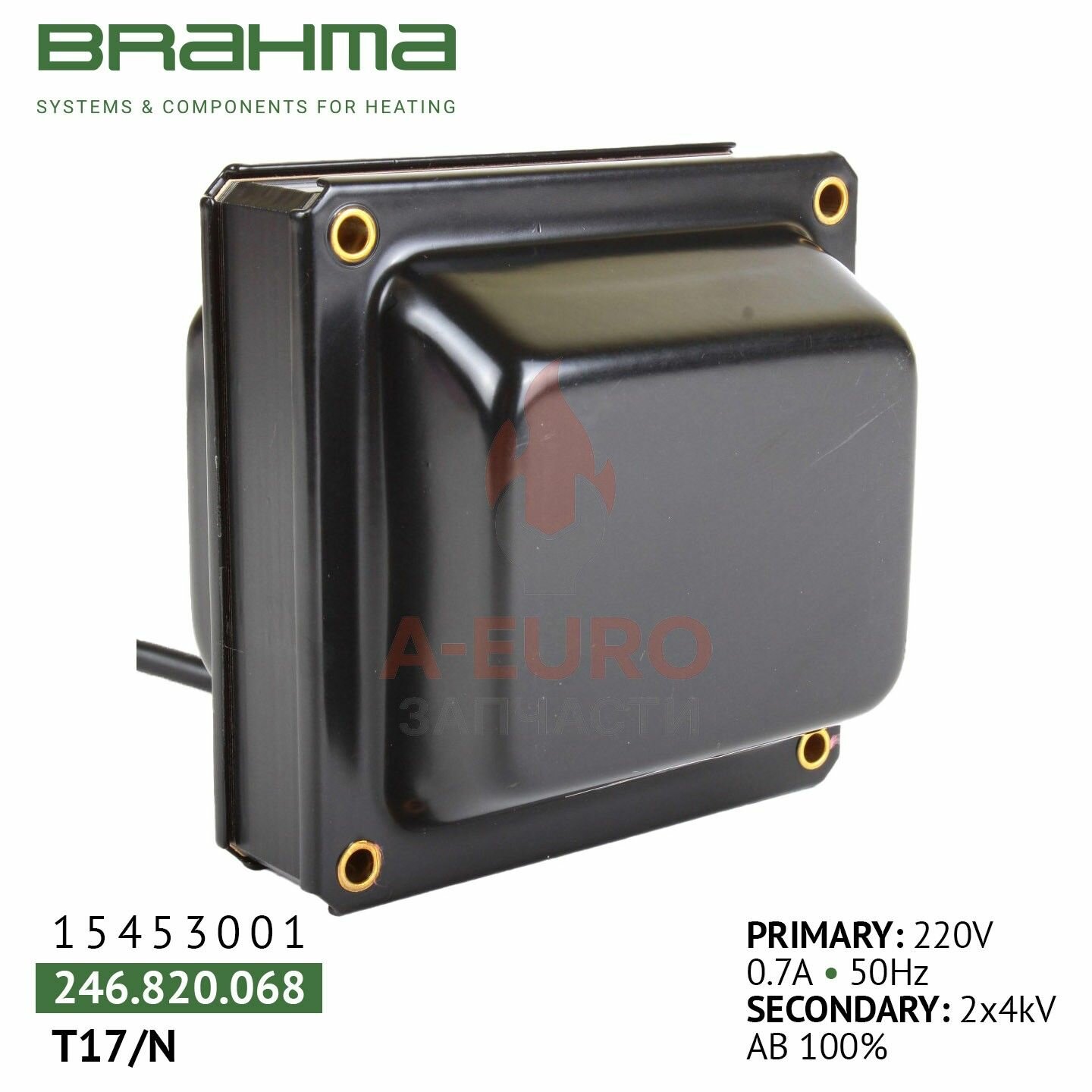 Устройство розжига BRAHMA T17/N 15453001 имеет конструкцию магнитопровода в форме оболочки. Вторичные обмотки этого трансформатора заземлены в центре. Для подавления радиопомех у высоковольтного трансформатора BRAHMA T17/N 15453001 есть экран, который должен быть надежно заземлен для эффективной работы. Два колпачка, окрашенных огнезащитной краской, покрывают катушки и объединяются с магнитной цепью в единое целое.