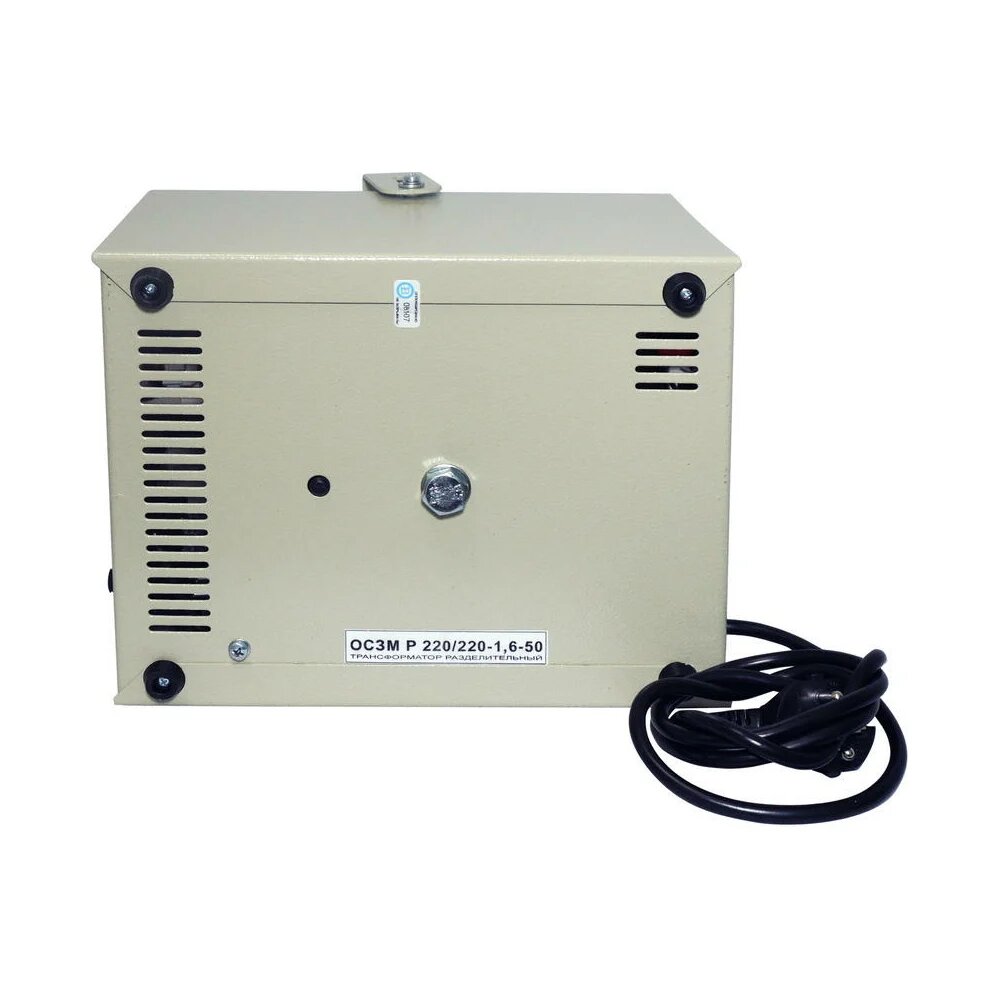 Трансформатор Штиль U вход 230 220, в корпусе осзм Р 220/220-1,6-50 представляет собой однофазный разделительный трансформатор в корпусе, предназначенный для электропитания приборов, инструментов, аппаратуры и устройств переменным током напряжением 220 (230) В, от стандартной электросети с напряжением 220 (230) В, при обеспечении гальванической развязки цепей питания нагрузки от электросети. Первичная и вторичные обмотки разделительного трансформатора не имеют гальванической связи и разделены экранирующей обмоткой, поэтому разделительный трансформатор выполняет также функцию фильтра импульсных помех, возникающих в питающей сети. Основным назначением изделия является повышение уровня безопасности работающих электрических приборов, соответственно - снижение уровня электротравматизма. Изделие может работать совместно со стабилизаторами напряжения и источниками бесперебойного питания переменного тока. Изделие состоит из следующих основных частей: металлический корпус, трансформатора разделительного на тороидальном сердечнике, выключатель «сеть», автомат защиты (для защиты изделия и подключённой к нему нагрузки от превышения потребляемого тока), сетевой шнур с евровилкой.