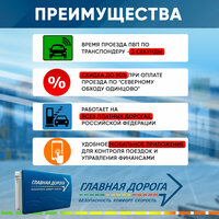 С его помощью вы сможете сэкономить время и получить выгоду до 30% при проезде по платной дороге "Проспект Багратиона" и до 75% при проезде по платной дороге "Северный обход Одинцова". Работает на всех дорогах Автодор. Также транспондер предоставляет выгоду в размере 30% при проезде по ЗСД СПБ. Благодаря этому устройству вы сможете проезжать через пункты взимания платы без остановки и оплачивать проезд на платных дорогах с помощью системы "Свободный поток", которая автоматически рассчитывает оплату на основе данных, полученных от датчиков и камер.