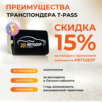 • Скидка до 15% по Программе лояльности «Автодор» на оплату проезда (полная информация о системе начисления баллов и уровне скидок на официальном сайте avtodor-tr.ru).