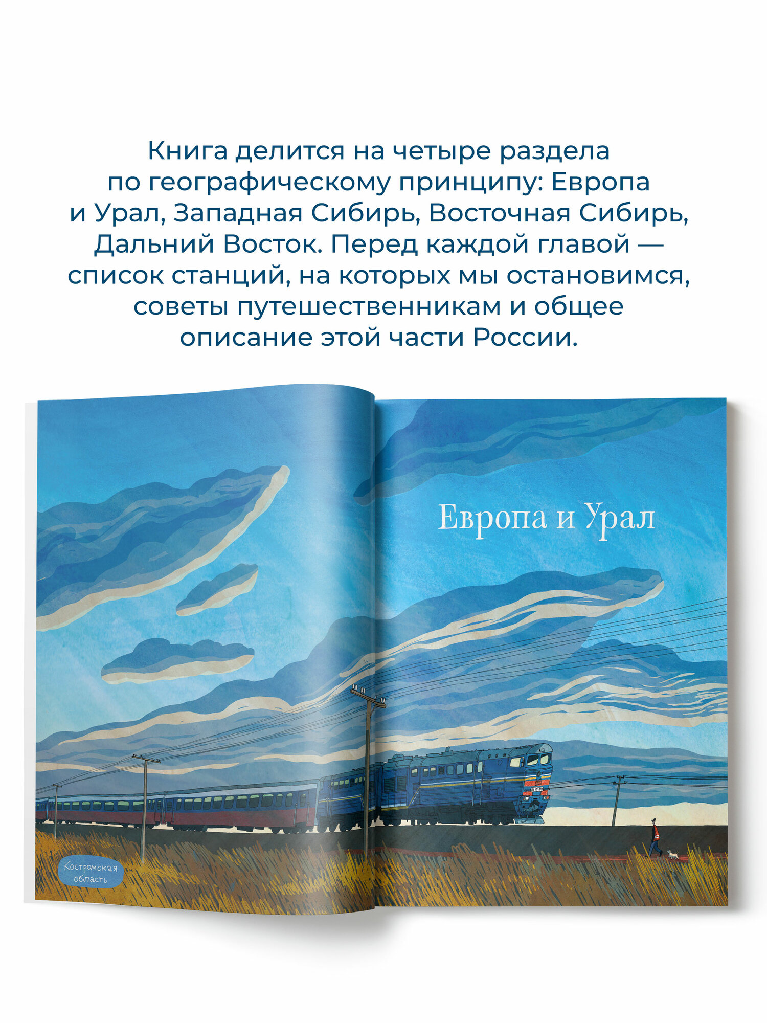 Книга делится на четыре раздела по географическому принципу: Европа и Урал, Западная Сибирь, Восточная Сибирь, Дальний Восток. Перед каждой главой — список станций, на которых мы остановимся, советы путешественникам и общее описание этой части России.