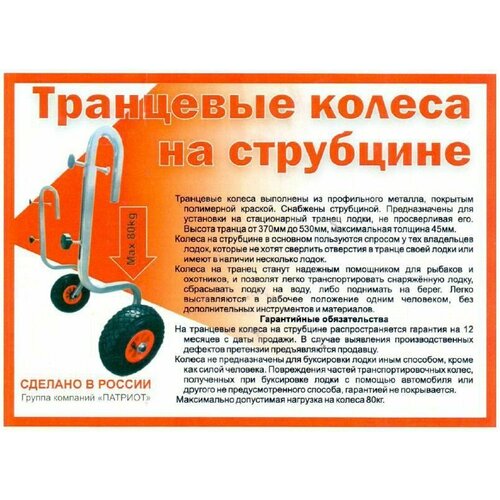 Транцевые колеса на стубцинах Патриот - это лодочные шасси, предназначенные для перевозки надувной лодки по суше, в т. ч. с установленным подвесным мотором, спуска на воду и вывода из воды на берег вручную одним человеком. Колеса рассчитаны на транспортировку лодки максимальным (лодка+мотор+снаряжение) весом до 100 кг. Стойки изготовлены из крашенной стали. Диаметр трубы стоек: мм. Длина штанги: см. Шасси снабжены двумя камерными колесами с капроновой ступицей диаметром 260 мм. Давление в колесах: не более 2 бар. Отсутствие ржавеющего подшипника- большой плюс при постоянном контакте изделия с водой.