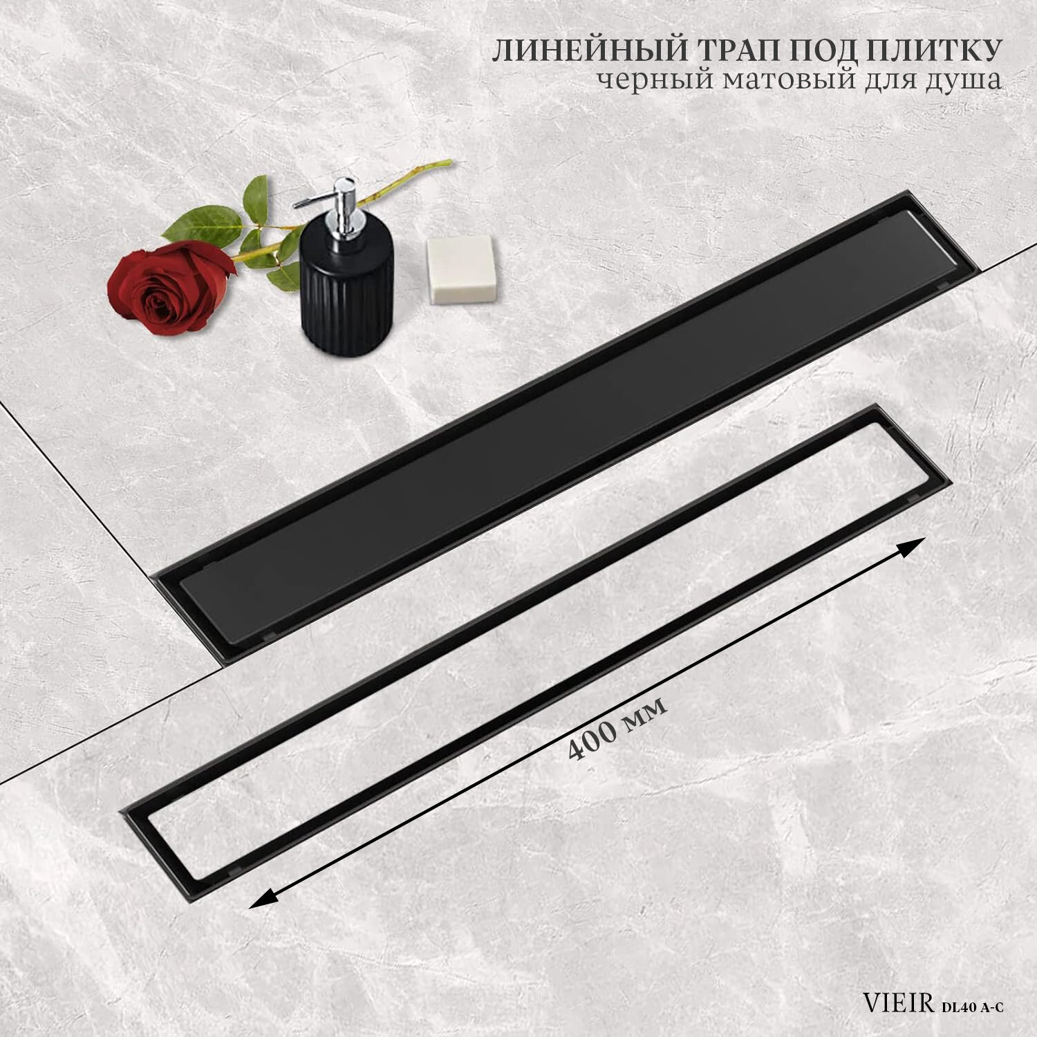 - Линейный трап черный матовый под плитку с горизонтальным выпуском из нержавеющей стали VIEIR 70х400мм с сухим и гидрозатвором DL40A-C для душа предназначен для отвода воды с пола или поддона под душем.