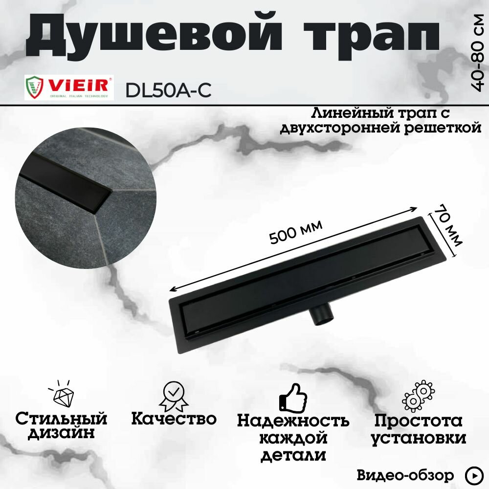 - Линейный трап черный матовый под плитку с горизонтальным выпуском из нержавеющей стали VIEIR 70х500мм с сухим и гидрозатвором DL50A-C для душа предназначен для отвода воды с пола или поддона под душем.