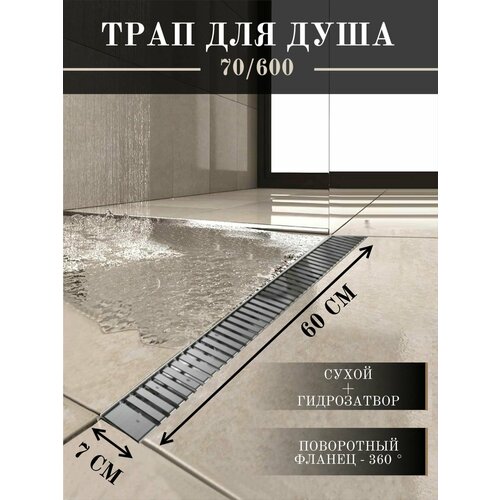 Размеры трапа 70x600 мм делают его компактным и незаметным, но в то же время достаточно производительным для эффективного отвода воды. Обтекаемый и современный дизайн данного душевого трапа позволяет прятать его под плитку, что сохраняет эстетичность вашего интерьера.