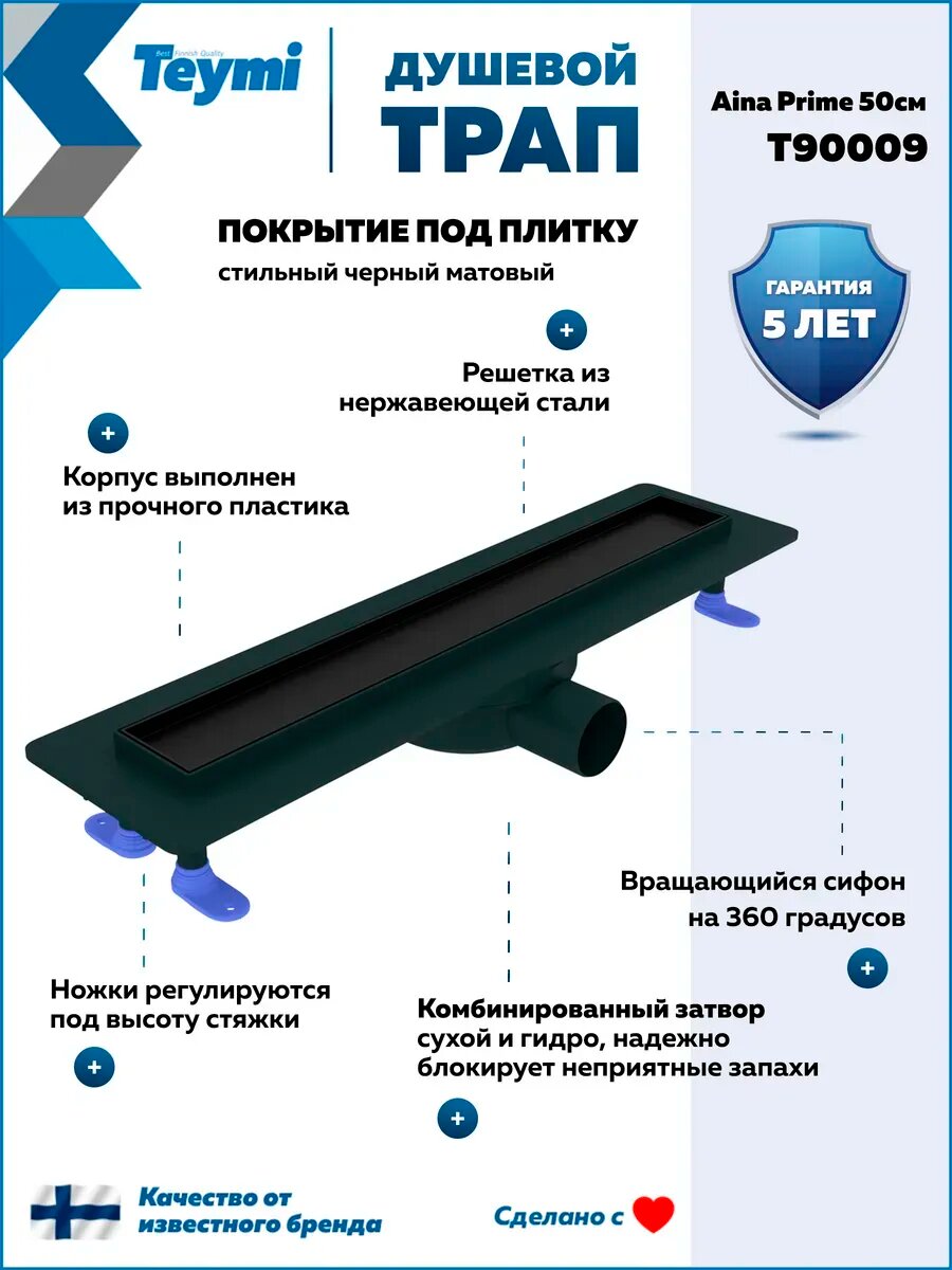 Купить Трап для душа под плитку с комбинированным гидрозатвором Teymi Aina Prime черный 50 см T90009 с доставкой по всей России.