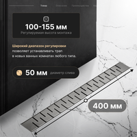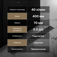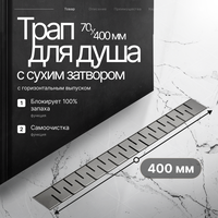 Трап-лоток с горизонтальным выпуском с сухим затвором цвет вороненая сталь 70х400 мм. Линейный трап предназначен для отвода воды с пола или поддона под душем. Душевой трап выполнен из нержавеющей стали, что позволит ему долгое время выполнять свои функции, сохраняя эстетический внешний вид.