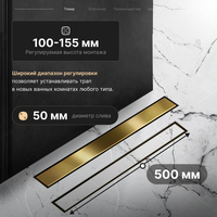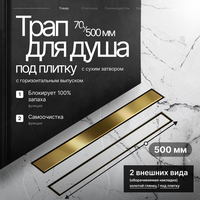 Трап-лоток BAD485002GP с горизонтальным выпуском с сухим затвором цвет глянцевое золото 70х500 мм. Линейный трап предназначен для отвода воды с пола или поддона под душем. Душевой трап выполнен из нержавеющей стали, что позволит ему долгое время выполнять свои функции, сохраняя эстетический внешний вид.