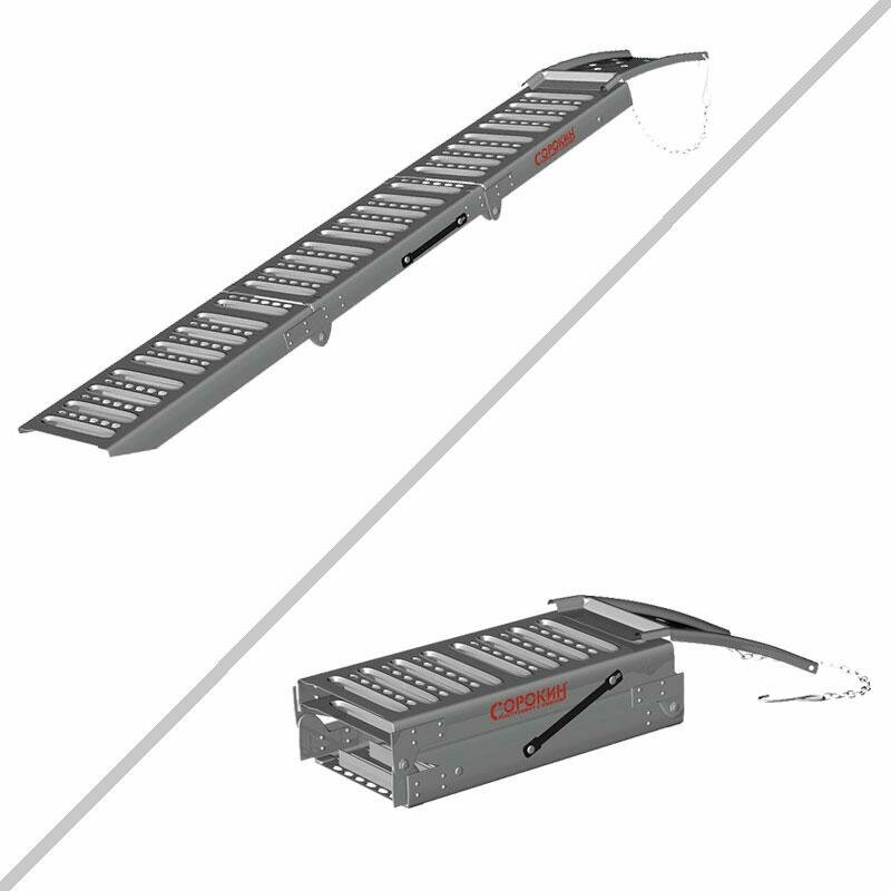Трап-эстакада предназначен для погрузки и выгрузки мотоциклов в транспортировочный автомобиль, а при использовании парно также и для квадроциклов, багги и другой подобной техники. В сложенном состоянии применяется как эстакада для автомобилей. Конструкция очень компактна за счет возможности складывать его и отсоединять опоры-стопоры. Поставляется по 1 штуке.