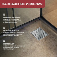 Трапы канализационные должны использоваться только во внутренних помещениях. При необходимости нужно производить снятие решетки и механического «сухого» затвора для очистки внутренней полости от грязи и мусора. При этом следует избегать чистки лицевой стороны решетки и рамки абразивными средствами, чтобы сохранить их внешний вид и качество.