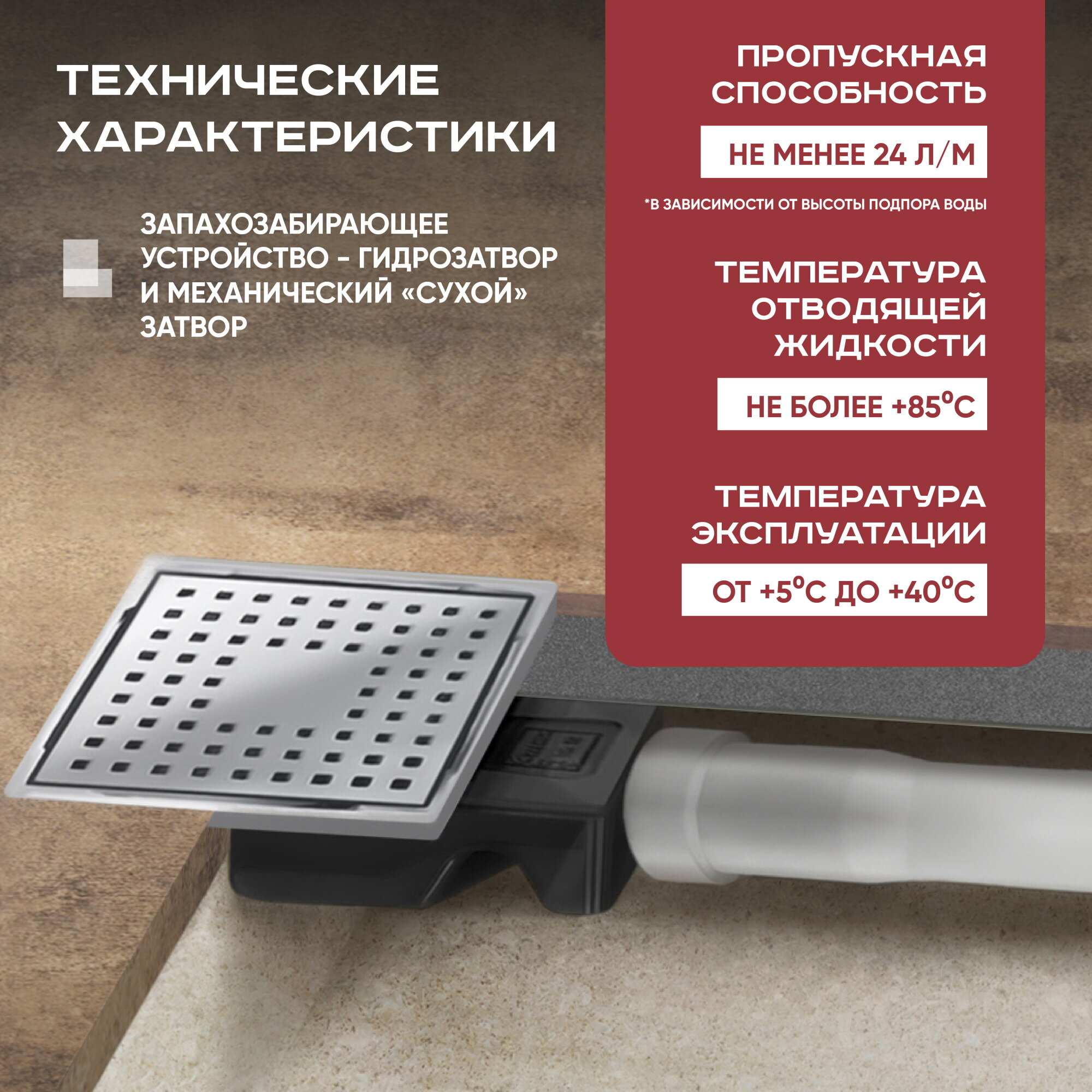 Душевой сливной трап обладает высокой пропускной способностью - до 35 литров в минуту. Отводимая жидкость не должна превышать +85 °C*. Максимальная разрешенная нагрузка составляет 300 кг, а срок службы не менее 50 лет при соблюдении условий эксплуатации.