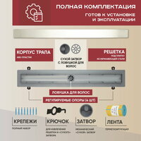 В комплект поставки входят решетка из нержавеющей стали AISI 304, корпус трапа из ABS-пластика, съемные регулируемые опоры (4 шт.), "сухой" затвор. Также в комплект поставки входит набор крепежа, герметизирующая лента.