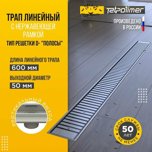 Трап линейный сливной для душа с сухим механическим затвором с перфорированной решеткой или под плитку 600 с рамкой ТП-50.1D-600 «Полосы» с вертикальным выходом