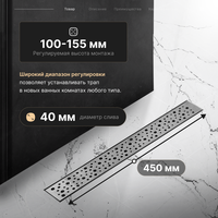 | Дополнительная информация | Скорость стока воды - 30 л/мин; Комплектация: Монтажный набор: шуруп 6х50 - 2шт., дюбель 10 - 2 шт., шуруп 4,2х38 - 2шт., дюбель 8 - 3 шт.; Самоклеящиеся гидроизоляционные ленты; Защитная пленка для воротника желоба и впускного отверстия сифона; Монтажный вкладыш для защиты лотка желоба; Монтажный набор для крепления регулируемых ножек: шуруп М6х12 - 2 шт. |
