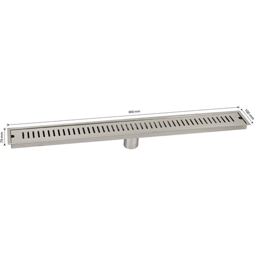 Душевой сливной трап из нержавеющей стали, линейный, вертикальный с гидрозатвором – это специальный элемент сантехнических коммуникаций, предназначенный для отвода воды в систему канализации. Как правило, душевые трапы устанавливаются непосредственно в пол. Благодаря небольшим габаритам и высоте душевые трапы идеальны для установки в душевых зонах. Это важно для организации пространства, где нет возможности установить классическую ванну: в малогабаритных квартирах, студиях, совмещенных санузлах и т. п. Габаритные размеры: высота 70 мм, ширина 100 мм, длина 800 мм, выход в канализацию 50 мм.