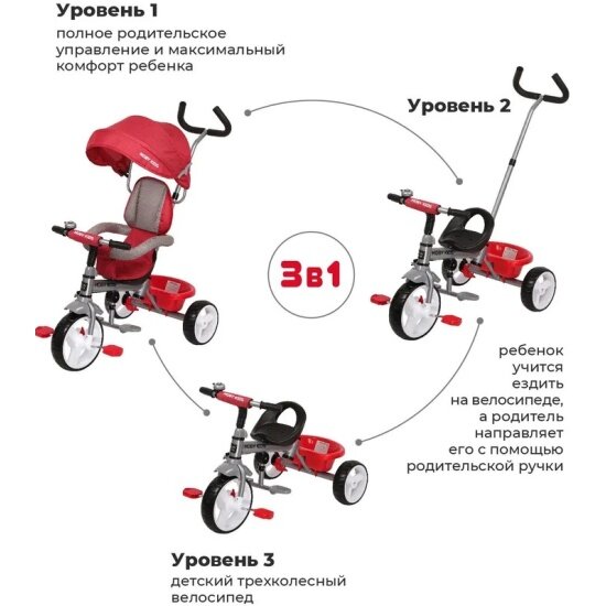 3 в 1: велосипед-коляска с полным родительским управлением, трёхколёсный велосипед с ручкой, трёхколёсный велосипед и полное управления ребёнком; наличие переключателя «свободного хода» переднего колеса; звонок на руле; складной тент колясочного типа с фиксаторами положения; большая корзина сзади велосипеда; ножной тормоз