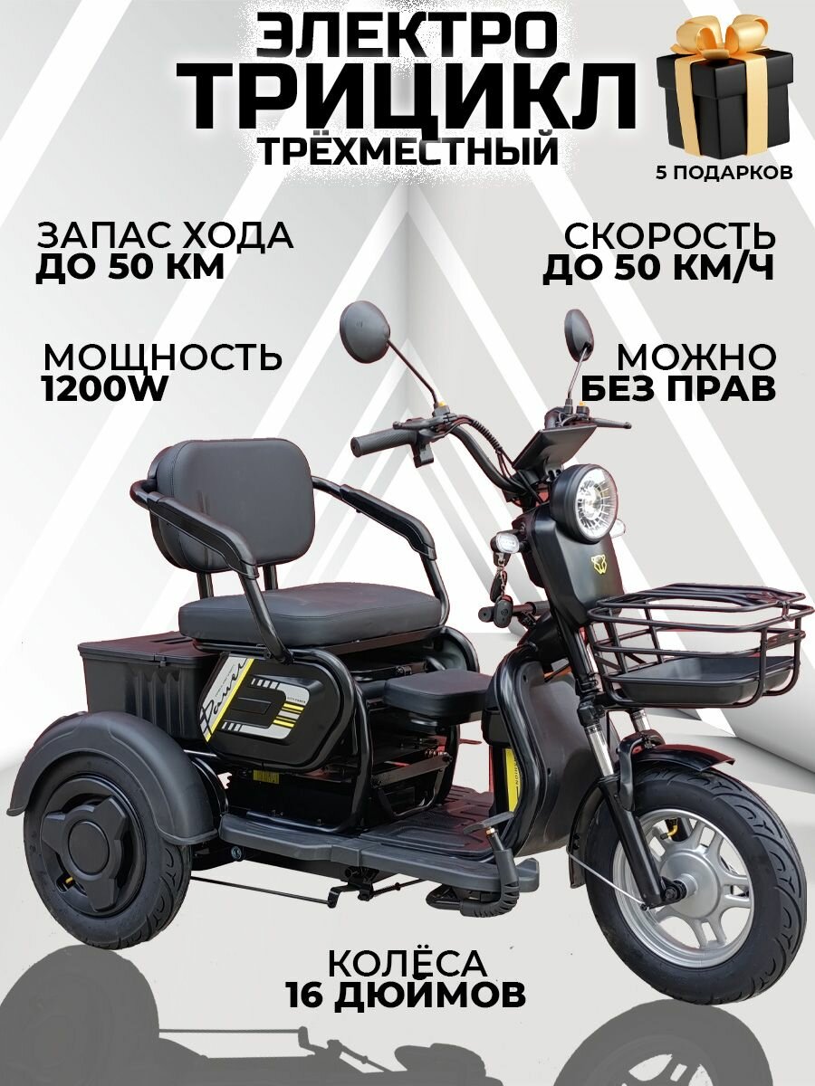 Трехместный электротрицикл для взрослых Leopard, 1200W, R16, 50 км/ч, черный: сравнение цен, характеристики, фото, актуальное наличие и цены.