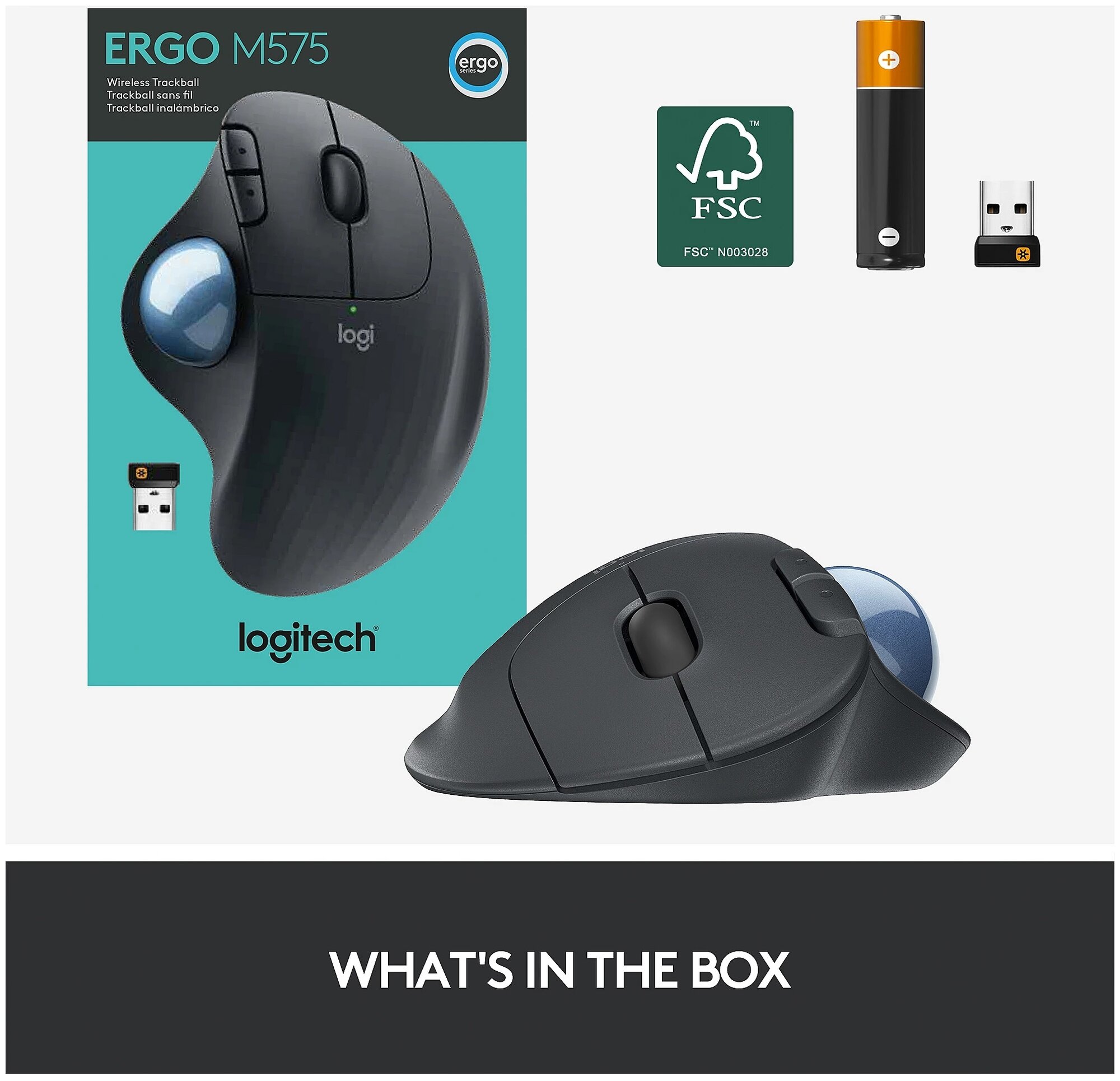 | Комплектация | беспроводной трекбол ERGO M575; USB-приемник Unifying; одна батарея типа AA; краткое руководство пользователя |