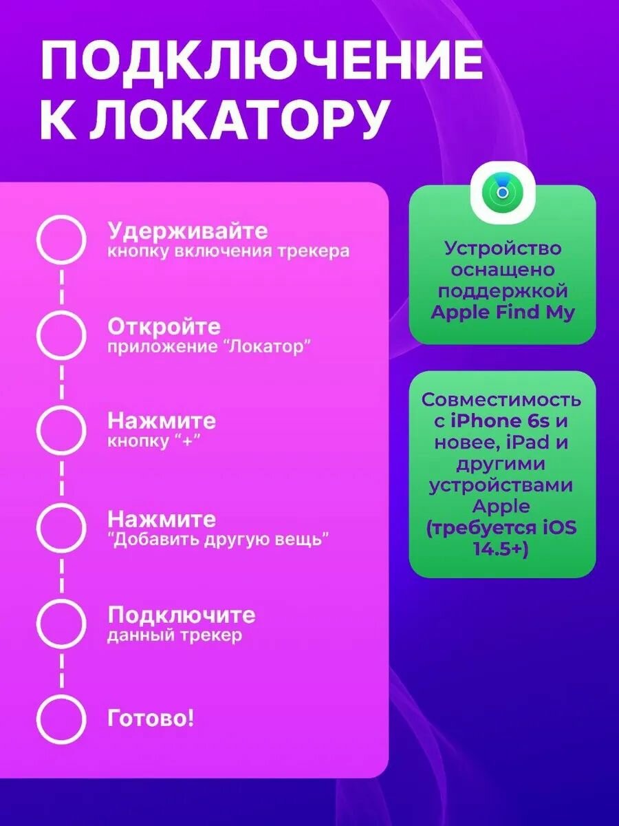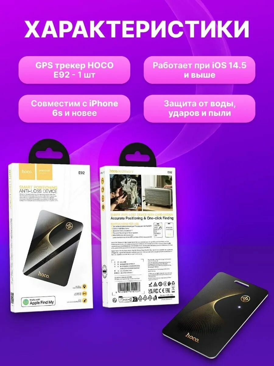 Комплект GPS-трекер Hoco E92 и беспроводная зарядка 15W от Hoco - это надежное и функциональное устройство для определения местоположения различных объектов. Устройство оснащено поддержкой Apple Find My. Материал изготовления метки - ABS, что обеспечивает прочность и долговечность устройства. Размер метки составляет 85.5*54*1.6 мм, а вес - 12,2 г. Благодаря компактным размерам и малому весу, метка легко крепится к различным объектам и не создает лишнего веса. Емкость аккумулятора составляет 110 мАч, что обеспечивает до 2-3 месяцев работы устройства на одном заряде. Метка поддерживает беспроводную зарядку, что делает ее удобной в использовании. Совместимость с iPhone 6s и новее, iPad и другими устройствами Apple (требуется iOS 14.5+). Устройство оснащено звуковым сигналом и Push-уведомлением для оповещения о местоположении объекта. Встроенный датчик перемещения позволяет отслеживать перемещение объекта в реальном времени. IP68 обеспечивает защиту от пыли и влаги, что делает метку устойчивой к различным погодным условиям. Беспроводное устройство MagSafe 15W зарядит iPhone быстро и качественно. За безопасность использования данного устройства можно не переживать: оно оснащено встроенной системой защиты от замыканий и перегрева. Не теряйте важные вещи – доверьте их поиск трекеру Hoco E92.